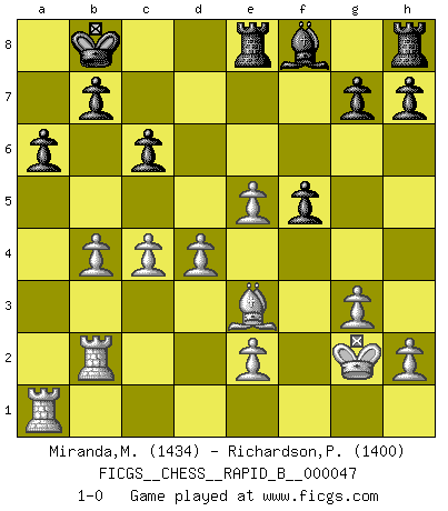Last move : 1-0 2007 May 4 15:30:30 [Event "FICGS__CHESS__RAPID_B__000047"] [Site "FICGS"] [Date "2007.04.09"] [Round "1"] [White "Miranda,Marcus"] [Black "Richardson,Patrick"] [Result "1-0"] [WhiteElo "1434"] [BlackElo "1400"] 1.c4 e5 2.Nc3 Nf6 3.Nf3 Nc6 4.g3 d5 5.cxd5 Nxd5 6.Bg2 Nxc3 7.bxc3 e4 8.Ng1 f5 9.f3 Qd5 10.Qb3 Qxb3 11.axb3 e3 12.d4 Be6 13.b4 Bc4 14.f4 O-O-O 15.Bxe3 Re8 16.Kf2 a6 17.Nf3 Bd5 18.Rhb1 Be4 19.Rb2 Kb8 20.Ne5 Nxe5 21.fxe5 Bxg2 22.Kxg2 c6 23.c4 1-0 English Opening Queenside Castling by player Black (move 14) Player White won this chess game. Follow this game move after move (download)Chess is so inspiring that I do not believe a good player is capable of having an evil thought during the game. (Wilhelm Steinitz) Matt entspricht nicht immer den Tatsachen. (Savielly Grigorievitsch Tartakower) Preferería tener un Peón que un dedo. (Reuben Fine) Il vaut toujours mieux jouer un plan faux de façon logique que de n'avoir pas de plan du tout. (Victor Kortchnoï) Unless in communicating with it one says exactly what one means, trouble is bound to result. (Alan Turing, about computers)
