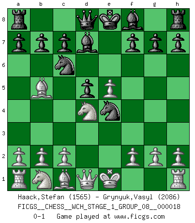 Last move : 0-1 2017 August 14 2:57:2 [Event "FICGS__CHESS__WCH_STAGE_1_GROUP_08__000018"] [Site "FICGS"] [Date "2017.07.01"] [Round "1"] [White "Haack,Stefan"] [Black "Grynyuk,Vasyl"] [Result "0-1"] [WhiteElo "1565"] [BlackElo "2086"] 1.e4 e5 2.Nf3 Nc6 3.d4 exd4 4.Bc4 Nf6 5.e5 d5 6.Bb5 Ne4 7.Nxd4 Bd7 0-1 This chess game has been lost on time (started : 2017.07.01 22:54:13) Scotch gambit : Dubois-Reti defense Player Black won this chess game. Follow this game move after move (download)Chess is like war on a board. (Bobby Fischer) Es gibt nur zwei wahre Schachgenies - das andere war Wilhelm Steinitz, der Weltmeister von 1872 bis 1894. (Robert James Fischer) El ganar no lo es todo... pero el perder es nada. (Mednis) Horreur, mais aussi harmonie suprême : qu'y avait-il en effet au monde en dehors des échecs ? Le brouillard, l'inconnu, le non-être... (Vladimir Nabokov) A good player is always lucky. (Capablanca)