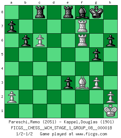 Last move : 1/2-1/2 2017 September 17 10:25:12 [Event "FICGS__CHESS__WCH_STAGE_1_GROUP_08__000018"] [Site "FICGS"] [Date "2017.07.01"] [Round "1"] [White "Pareschi,Remo"] [Black "Kappel,Douglas"] [Result "1/2-1/2"] [WhiteElo "2051"] [BlackElo "1901"] 1.c4 Nf6 2.d4 g6 3.Nc3 d5 4.g3 Bg7 5.cxd5 Nxd5 6.Bg2 Nxc3 7.bxc3 c5 8.e3 Qa5 9.Ne2 cxd4 10.exd4 O-O 11.O-O Nc6 12.Qb3 Rd8 13.d5 Ne5 14.Bg5 Re8 15.Nd4 Bd7 16.Rab1 b6 17.Qb4 Qxb4 18.cxb4 Rac8 19.b5 h6 20.Be3 Nc4 21.Nc6 Bf8 22.Bf4 g5 23.Be3 e5 24.Rbc1 Nxe3 25.fxe3 e4 26.Rf6 Bc5 27.Rcf1 Bxe3+ 28.Kh1 Bc5 29.d6 e3 30.Rxf7 Bxc6 31.bxc6 Bxd6 32.Bd5 Kh8 33.R1f6 Bf8 34.Bf3 Kg8 1/2-1/2 English, 1...Nf6 (Anglo-Indian defense) Kingside Castling by player Black (move 10) Kingside Castling by player White (move 11) This chess game ended in a draw. Follow this game move after move (download)A passed Pawn increases in strength as the number of pieces on the board diminishes. (Capablanca) Das ganze Leben mit einer Ehefrau ist wie ein Endspiel mit ungleichfarbigen Läufern. (Viktor Kortschnoi) La belleza de un movimiento no se refleja solo en su apariencia, sino en el pensamiento detrás de él. (Siegbert Tarrasch) On est toujours la mazette de quelqu'un d'autre. (Anonyme) Is not life a hundred times too short to bore ourselves ? (Friedrich Nietzsche)