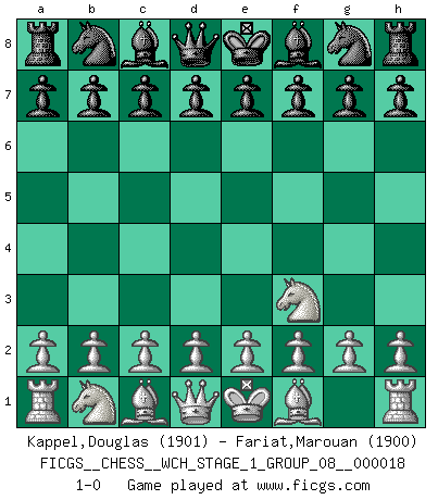 Last move : 1-0 2017 August 1 1:0:16 [Event "FICGS__CHESS__WCH_STAGE_1_GROUP_08__000018"] [Site "FICGS"] [Date "2017.07.01"] [Round "1"] [White "Kappel,Douglas"] [Black "Fariat,Marouan"] [Result "1-0"] [WhiteElo "1901"] [BlackElo "1900"] 1.Nf3 1-0 This chess game has been lost on time (started : 2017.07.01 22:54:13) Reti Opening Player White won this chess game. Follow this game move after move (download)An attack on the wing should be met by play in the center. (Nimzovitch) Ivan Sokolov treibt mich als Beifahrer an mit go Loeky go - . (Loek van Wely) Bobby Fischer es el mas grande genio de Ajedrez de todos los tiempos. (Alexander Kotov) Les Echecs sont et restent toujours un combat, un combat intégral comme la boxe, la lutte ou un autre sport, et où il doit y avoir un vainqueur et un vaincu. (Joseph Emil Diemer) For peace of mind, resign as general manager of the universe. (Douglas Adams)