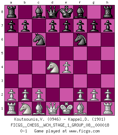 Last move : 0-1 2017 August 6 1:44:0 [Event "FICGS__CHESS__WCH_STAGE_1_GROUP_08__000018"] [Site "FICGS"] [Date "2017.07.01"] [Round "1"] [White "Koutsounis,Vassilios"] [Black "Kappel,Douglas"] [Result "0-1"] [WhiteElo "0946"] [BlackElo "1901"] 1.e4 c5 2.Nf3 Nc6 3.d4 cxd4 4.Nxd4 Nf6 0-1 This chess game has been lost on time (started : 2017.07.01 22:54:13) Sicilian defense Player Black won this chess game. Follow this game move after move (download)Modern Chess is too much concerned with things like Pawn structure. Forget it, Checkmate ends the game. (Nigel Short) Man gibt nur Pakete auf. (Paul Keres) Aquellos que dicen que entienden al Ajedrez, no entienden nada. (Robert Hubner) Le génie consiste à savoir transgresser les règles au moment opportun. (Teichmann) There is no vagueness without wind. (Chinese proverb)