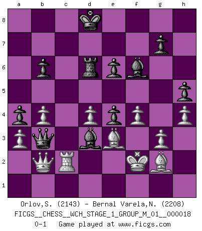 Last move : 0-1 2017 October 25 15:23:1 [Event "FICGS__CHESS__WCH_STAGE_1_GROUP_M_01__000018"] [Site "FICGS"] [Date "2017.07.01"] [Round "1"] [White "Orlov,Vladimir"] [Black "Bernal Varela,Nelson"] [Result "0-1"] [WhiteElo "2143"] [BlackElo "2208"] 1.e4 e6 2.d4 d5 3.Nc3 Nf6 4.e5 Nfd7 5.f4 c5 6.Nf3 Nc6 7.Be3 Be7 8.Qd2 a6 9.a3 b6 10.Bd3 O-O 11.O-O f6 12.exf6 Nxf6 13.Ne5 Qc7 14.Nxc6 Qxc6 15.Be2 Bb7 16.Bf3 Ne4 17.Nxe4 dxe4 18.Bg4 Rad8 19.c3 Bf6 20.Rac1 a5 21.Rfd1 cxd4 22.cxd4 Qd5 23.b4 a4 24.Rc7 Ba6 25.Rdc1 Bb5 26.g3 Rf7 27.h4 Rxc7 28.Rxc7 h6 29.Bh3 Rd6 30.Bg4 Kf8 31.Kf2 h5 32.Bh3 Ke8 33.Rc3 Bd3 34.Rc8+ Ke7 35.Qb2 Bb5 36.Rc7+ Kd8 37.Rc2 Qb3 38.Bg2 Bd3 0-1 French : Steinitz, Boleslavsky variation Kingside Castling by player Black (move 10) Kingside Castling by player White (move 11) Player Black won this chess game. Follow this game move after move (download)Fischer prefers to enter Chess history alone. (Miguel Najdorf) Am wohlsten fühle ich mich, wenn ich sehe, wie sich mein Gegner im Todeskampf windet. (Robert James Fischer) Personalmente, yo prefiero mirar hacia el futuro en donde un programa de computadora gane el título mundial de Ajedrez. La humanidad necesita una lección de humildad. (Richard Dawkings) Une platitude souvent récitée à propos des Echecs est qu'une des choses les plus difficiles à réaliser est de gagner une position gagnante. Cela ne manque pas de sens mais, pour ma part, j'ai toujours trouvé plus difficile de gagner une position perdante. (Tim Krabbe) Go and wake up your luck. (Persian saying)