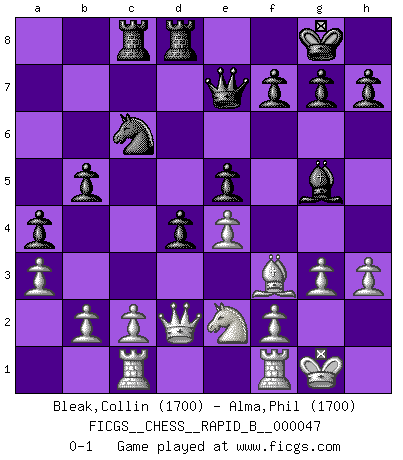 Last move : 0-1 2007 June 14 20:51:0 [Event "FICGS__CHESS__RAPID_B__000047"] [Site "FICGS"] [Date "2007.04.09"] [Round "1"] [White "Bleak,Collin"] [Black "Alma,Phil"] [Result "0-1"] [WhiteElo "1700"] [BlackElo "1700"] 1.Nf3 Nf6 2.g3 d5 3.Bg2 c5 4.d4 cxd4 5.Nxd4 e5 6.Nb3 Be7 7.O-O O-O 8.N1d2 Qc7 9.Nf3 a5 10.Bd2 Nc6 11.e3 a4 12.Nc1 Rd8 13.Ne2 Bg4 14.Bc3 b5 15.a3 Rac8 16.Rc1 Ne4 17.Qd3 Nxc3 18.Qxc3 Bf6 19.Qd2 d4 20.e4 Qe7 21.h3 Bxf3 22.Bxf3 Bg5 0-1 Reti Opening Kingside Castling by player White (move 7) Kingside Castling by player Black (move 7) Player Black won this chess game. Follow this game move after move (download)Combinations have always been the most intriguing aspect of Chess. The masters look for them, the public applauds them, the critics praise them. It is because combinations are possible that Chess is more than a lifeless mathematical exercise. They are the poetry of the game; they are to Chess what melody is to music. They represent the triumph of mind over matter. (Reuben Fine) Fischer machte Schach einfach zu einer aufregenden Sache, wann immer er sich ans Brett setzte. (Raymond Keene) Uno no tiene que jugar muy bien, es suficiente jugar mejor que el oponente. (Siegbert Tarrasch) Soyez une menace à chaque fois que vous vous asseyez pour jouer. (Ken Smith) Chess is as much a mystery as women. (Purdy)