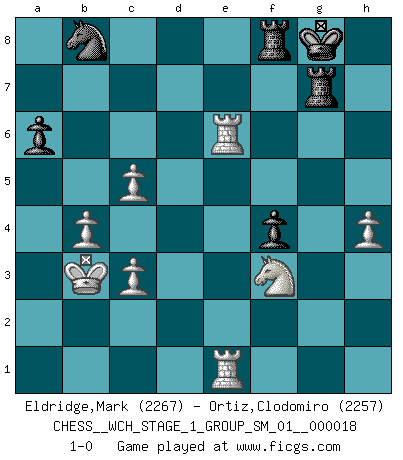 Last move : 1-0 2017 November 18 0:11:18 [Event "FICGS__CHESS__WCH_STAGE_1_GROUP_SM_01__000018"] [Site "FICGS"] [Date "2017.07.01"] [Round "1"] [White "Eldridge,Mark"] [Black "Ortiz,Clodomiro"] [Result "1-0"] [WhiteElo "2267"] [BlackElo "2257"] 1.e4 g6 2.d4 Bg7 3.Nc3 d6 4.Be3 a6 5.f4 b5 6.Bd3 Bb7 7.Nf3 Nd7 8.e5 c5 9.Be4 Bxe4 10.Nxe4 Nh6 11.dxc5 Ng4 12.Qe2 dxe5 13.O-O-O Qc7 14.fxe5 Ngxe5 15.Nc3 Nf6 16.Rhe1 O-O 17.Nxe5 Qxe5 18.Bg1 Qxe2 19.Rxe2 Rfe8 20.b4 e6 21.Bd4 Rad8 22.g3 Kf8 23.R1d2 Ke7 24.Kb1 Kf8 25.Be5 Nh5 26.Bxg7+ Nxg7 27.a4 bxa4 28.Kb2 Nf5 29.Ne4 Nd4 30.Rf2 Nc6 31.Nd6 Re7 32.Ka3 f5 33.Kxa4 Red7 34.g4 Ke7 35.c3 Kf6 36.Rde2 Re7 37.Kb3 h5 38.gxh5 gxh5 39.h4 Rb8 40.Ne4+ Kf7 41.Rf1 Rd8 42.Nd6+ Kf6 43.Ra1 Ra7 44.Rae1 Re7 45.Rf1 Rb8 46.Ne4+ Kg6 47.Rg2+ Kh6 48.Nd6 Rf8 49.Nc4 Rd8 50.Ra1 Nb8 51.Ne5 f4 52.Rg6+ Kh7 53.Rg5 Rg7 54.Rxh5+ Kg8 55.Rh6 Nd7 56.Nf3 Nb8 57.Rxe6 Rf8 58.Rae1 1-0 Robatsch (Modern) defense Queenside Castling by player White (move 13) Kingside Castling by player Black (move 16) Player White won this chess game. Follow this game move after move (download)You can only get good at Chess if you love the game. (Bobby Fischer) Als ich elf wurde, wurde ich einfach gut. (Robert James Fischer) No todos los artistas son jugadores de Ajedrez, pero todos los jugadores de Ajedrez son artistas. (Marcel Duchamp) Même si vous avez un bon coup à faire, regardez toujours s'il n'y en a pas un qui lui soit préférable. (Pedro Damiano) If things go wrong, don't go with them. (Roger Babson)
