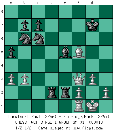 Last move : 1/2-1/2 2017 August 16 12:27:24 [Event "FICGS__CHESS__WCH_STAGE_1_GROUP_SM_01__000018"] [Site "FICGS"] [Date "2017.07.01"] [Round "1"] [White "Larwinski,Paul"] [Black "Eldridge,Mark"] [Result "1/2-1/2"] [WhiteElo "2256"] [BlackElo "2267"] 1.c4 e5 2.g3 Nf6 3.Bg2 d5 4.cxd5 Nxd5 5.Nf3 Nc6 6.O-O Nb6 7.b3 Be7 8.Bb2 f6 9.d3 O-O 10.Nbd2 Be6 11.Rc1 Re8 12.a3 Qd7 13.Qc2 a5 14.Rfd1 Rad8 15.d4 exd4 16.Ne4 f5 17.Nxd4 fxe4 18.Bxe4 Bd6 19.Nf5 Bxf5 20.Bxf5 Re6 21.Bxh7+ Kh8 22.Bf5 Rxe2 23.Bxg7+ Kxg7 24.Qc3+ Be5 25.Rxd7+ Rxd7 26.Qf3 R7d2 27.Rf1 1/2-1/2 English Opening Kingside Castling by player White (move 6) Kingside Castling by player Black (move 9) This chess game ended in a draw. Follow this game move after move (download)There just isn't enough televised Chess. (David Letterman) Eine Person mit durchschnittlichem IQ kann etwa eine ELO von 2000 erreichen. (Jonathan Levitt) En el Ajedrez, tal como es jugado por los Maestros, practicamente la suerte es eliminada. (Emanuel Lasker) Il n'y a pas eu de défaite parce que je ne crois pas que cet ordinateur ait jamais existé. IBM a triché en refusant d'imprimer les modes de recherche de la machine. C'est évident, pendant le match, des coups décisifs ont été joués par des êtres humains. Aujourd'hui, les meilleurs spécialistes en informatique ne peuvent toujours pas expliquer comment Deep-Blue a pu jouer contre la logique des ordinateurs. IBM a gagné une guerre de communication, mais ils sont incapables de prouver que l'ordinateur a gagné tout seul. (Garry Kasparov) The Movers & Shakers of this world are those who play chess in the mornings and go to the disco in the evenings. (Dinesh De Silva)