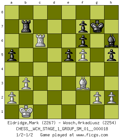 Last move : 1/2-1/2 2017 September 3 20:23:23 [Event "FICGS__CHESS__WCH_STAGE_1_GROUP_SM_01__000018"] [Site "FICGS"] [Date "2017.07.01"] [Round "1"] [White "Eldridge,Mark"] [Black "Wosch,Arkadiusz"] [Result "1/2-1/2"] [WhiteElo "2267"] [BlackElo "2254"] 1.e4 c5 2.Nf3 Nc6 3.d4 cxd4 4.Nxd4 Nf6 5.Nc3 d6 6.Bg5 e6 7.Qd2 a6 8.O-O-O Bd7 9.f4 b5 10.Bxf6 gxf6 11.Kb1 Qb6 12.Nxc6 Bxc6 13.f5 Qc5 14.Bd3 h5 15.Qe1 b4 16.Nd5 Bxd5 17.exd5 e5 18.c3 a5 19.Rc1 Bh6 20.Rc2 bxc3 21.Rxc3 Qd4 22.Qe2 Kf8 23.Rc4 Qb6 24.Rc6 Qd4 25.Rxd6 Rb8 26.Rc6 Kg7 27.Rd1 Qxd5 28.Be4 Qb5 29.Qxb5 Rxb5 30.Rd7 Rhb8 31.b3 R8b7 32.Rxb7 Rxb7 33.Bf3 1/2-1/2 Sicilian defense Queenside Castling by player White (move 8) This chess game ended in a draw. Follow this game move after move (download)Chess is a beautiful mistress. (Bent Larsen) Man gibt nur Pakete auf. (Paul Keres) Botvinnik trataba de restarle el misterio al Ajedrez, siempre relacionandolo a situaciones de la vida ordinaria. El gustaba de llamar al Ajedrez un típico problema inexacto similar a aquellos de los cuales la gente siempre tiene que enfrentarse en la vida cotidiana. (Garry Kasparov) Nous vivons dans un monde échiquéen : chaque jour qui passe est un défi à relever. (Philosophe Sasha) Creativity is allowing yourself to make mistakes. Art is knowing which ones to keep. (Scott Adams)