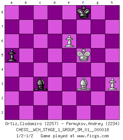 Last move : 1/2-1/2 2017 September 24 20:59:6 [Event "FICGS__CHESS__WCH_STAGE_1_GROUP_SM_01__000018"] [Site "FICGS"] [Date "2017.07.01"] [Round "1"] [White "Ortiz,Clodomiro"] [Black "Permykov,Andrey"] [Result "1/2-1/2"] [WhiteElo "2257"] [BlackElo "2234"] 1.Nf3 Nf6 2.d4 d5 3.c4 c6 4.g3 dxc4 5.Bg2 g6 6.a4 Bg7 7.Na3 Ne4 8.Nxc4 Be6 9.Qc2 Nd6 10.Nxd6+ exd6 11.O-O O-O 12.e4 Re8 13.Bg5 Qd7 14.Be3 Qe7 15.Qd2 d5 16.e5 a5 17.Ng5 Bf5 18.h3 Qb4 19.g4 Qxd2 20.Bxd2 Bd7 21.f4 Na6 22.Bxa5 Nc5 23.dxc5 Rxa5 24.b4 Ra7 25.Rfe1 f5 26.gxf5 Bxf5 27.a5 h6 28.Nf3 g5 29.fxg5 hxg5 30.Ra3 R7a8 31.Rae3 Bg6 32.Bf1 Rf8 33.Nxg5 Rae8 34.Kg2 Rf5 35.Nf3 Rf4 36.b5 Ra4 37.a6 bxa6 38.bxc6 Ra5 39.Rc3 Be4 40.Kf2 Rf8 41.Kg3 Bxf3 42.Rxf3 Rxc5 43.e6 Rxc6 44.Bg2 Rc3 45.Kg4 Rcxf3 46.Bxf3 Bc3 47.Rd1 Kg7 48.Rxd5 Kf6 49.Rf5+ Ke7 50.Rxf8 Kxf8 51.Kf5 a5 1/2-1/2 Reti Opening Kingside Castling by player White (move 11) Kingside Castling by player Black (move 11) 10 pieces endgame at move 46 : White KRBPP , Black KRBPP WHITE : King + 1 Rook 1 Bishop 2 Pawns BLACK : King + 1 Rook 1 Bishop 2 Pawns 9 pieces endgame at move 48 : White KRBPP , Black KRBP WHITE : King + 1 Rook 1 Bishop 2 Pawns BLACK : King + 1 Rook 1 Bishop 1 Pawn 8 pieces endgame at move 50 : White KRBPP , Black KBP WHITE : King + 1 Rook 1 Bishop 2 Pawns BLACK : King + 1 Bishop 1 Pawn 7 pieces endgame at move 50 : White KBPP , Black KBP WHITE : King + 1 Bishop 2 Pawns BLACK : King + 1 Bishop 1 Pawn This chess game ended in a draw. Follow this game move after move (download)I'm not a materialistic person, in that, I don't suffer the lack or loss of money. The absence of worldly goods I don't look back on. For Chess is a way I can be as materialistic as I want without having to sell my soul. (Jamie Walter Adams) Wenn ich einen Club besuche, sind die Spieler stumm vor Staunen. (José Raúl Capablanca) Los libros de Ajedrez deben de usarse igual como usamos los anteojos: para mejorar la vista, aunque algunos jugadores los quieren usar como si ellos les otorgaran la vision. (José Raúl Capablanca) Le temps de noter son nom sur la feuille de partie, j'étais déjà en zeitnot ! D'un modeste amateur apparié lors de la première ronde d'un open contre le grand-maître Azmaïparashvili. But they are useless. They can only give you answers. (Pablo Picasso, about computers)
