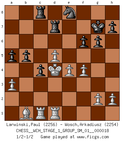 Last move : 1/2-1/2 2017 August 15 7:43:41 [Event "FICGS__CHESS__WCH_STAGE_1_GROUP_SM_01__000018"] [Site "FICGS"] [Date "2017.07.01"] [Round "1"] [White "Larwinski,Paul"] [Black "Wosch,Arkadiusz"] [Result "1/2-1/2"] [WhiteElo "2256"] [BlackElo "2254"] 1.Nf3 Nf6 2.d4 g6 3.c4 Bg7 4.Nc3 d5 5.cxd5 Nxd5 6.e4 Nxc3 7.bxc3 c5 8.Be3 Qa5 9.Qd2 O-O 10.Rc1 Nd7 11.Bd3 e5 12.Bh6 exd4 13.Bxg7 Kxg7 14.cxd4 Qxd2+ 15.Kxd2 b6 16.Bb5 Rd8 17.d5 Nf6 18.Rhe1 Bd7 19.Bd3 Re8 20.Kc3 b5 21.Nd2 Rab8 22.f4 a5 23.Nf3 c4 24.Bb1 Red8 25.Ne5 Rbc8 26.a3 Ne8 27.Kd4 f6 28.Nxd7 Rxd7 29.Red1 1/2-1/2 Reti Opening Kingside Castling by player Black (move 9) This chess game ended in a draw. Follow this game move after move (download)I feel as if I were a piece in a game of Chess, when my opponent says of it: That piece cannot be moved. (Soren Kierkegaard) Schach ist das Spiel, das die Verrückten gesund hält. (Albert Einstein) El Ajedrez es un juego de pelea el cual es puramente intelectual e incluye la suerte. (Richard Reti) Pour moi, les échecs ne sont pas un jeu mais un art. (Alexandre Alekhine) Wikichess, chess moves explained by 'experimented' players. (Thibault de Vassal)