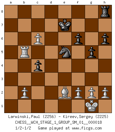 Last move : 1/2-1/2 2017 July 12 18:45:51 [Event "FICGS__CHESS__WCH_STAGE_1_GROUP_SM_01__000018"] [Site "FICGS"] [Date "2017.07.01"] [Round "1"] [White "Larwinski,Paul"] [Black "Kireev,Sergey"] [Result "1/2-1/2"] [WhiteElo "2256"] [BlackElo "2225"] 1.d4 d5 2.c4 c6 3.Nf3 Nf6 4.Nc3 e6 5.Bg5 h6 6.Bh4 dxc4 7.e4 g5 8.Bg3 b5 9.Be2 Bb7 10.O-O Nbd7 11.Ne5 Bg7 12.Nxd7 Nxd7 13.Bd6 a6 14.a4 Bf8 15.Bxf8 Kxf8 16.e5 c5 17.axb5 axb5 18.Rxa8 Qxa8 19.dxc5 Bd5 20.Nxd5 Qxd5 21.Qxd5 exd5 22.Rd1 Ke7 23.Rxd5 Ke6 24.Rd6+ Ke7 25.Rd5 Ke6 26.Rd6+ Ke7 27.c6 Nxe5 28.Rd5 f6 29.Rxb5 1/2-1/2 QGD Slav : 4.Nc3 Kingside Castling by player White (move 10) This chess game ended in a draw. Follow this game move after move (download)In Chess, as it is played by masters, chance is practically eliminated. (Emanuel Lasker) Meine Liebe ist Schach, Schach, Schach. Ich muss jeden Tag Schach spielen, deshalb fühle ich mich so stark. (Miguel Najdorf) Yo creo que el Ajedrez posee una magia que es también una ayuda en la edad avanzada. Una rodilla reumática es olvidada durante una partida de Ajedrez y otros eventos pueden parecer algo sin importancia comparada a una catástrofe en el tablero de Ajedrez. (Vlastimil Hort) Toutes choses étant égales, c'est la conviction qui gagne. Alliée à une volonté de vaincre, elle sert de détonateur, suscite des idées, disperse les doutes et aide à penser clairement. (Robert Fischer) May the force be with you. (Han Solo in Star Wars ep.4)