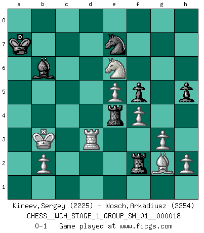 Last move : 0-1 2017 August 27 14:18:55 [Event "FICGS__CHESS__WCH_STAGE_1_GROUP_SM_01__000018"] [Site "FICGS"] [Date "2017.07.01"] [Round "1"] [White "Kireev,Sergey"] [Black "Wosch,Arkadiusz"] [Result "0-1"] [WhiteElo "2225"] [BlackElo "2254"] 1.e4 c5 2.Nf3 Nc6 3.d4 cxd4 4.Nxd4 Nf6 5.Nc3 d6 6.Bg5 e6 7.Qd2 a6 8.O-O-O Bd7 9.f4 b5 10.Bxf6 gxf6 11.Kb1 Qb6 12.Nce2 h5 13.Qd3 Ne7 14.g3 Rd8 15.Nf3 d5 16.e5 f5 17.Ned4 Nc6 18.Nb3 Rb8 19.c3 a5 20.Be2 a4 21.Nbd4 b4 22.c4 dxc4 23.Qxc4 Bc5 24.Nxf5 exf5 25.Rxd7 Kxd7 26.Rc1 b3 27.Qxf7+ Ne7 28.axb3 axb3 29.Ng5 Ra8 30.Rc3 Ra2 31.Qc4 Rha8 32.Rd3+ Kc8 33.Rxb3 Ra1+ 34.Kc2 R8a4 35.Qe6+ Qxe6 36.Nxe6 Bg1 37.Rc3+ Kb8 38.Rb3+ Ka7 39.Bf3 Bb6 40.Rd3 Rf1 41.Kb3 Re4 42.Bg2 Rf2 0-1 Sicilian defense Queenside Castling by player White (move 8) Player Black won this chess game. Follow this game move after move (download)There are two types of sacrifices: correct ones and mine. (Mikhail Tal) Gewöhnliche Menschen denken nur daran, wie sie ihre Zeit verbringen. Ein intelligenter Mensch versucht, sie auszunutzen. (Arthur Schopenhauer) En un gambito tu regalas un Peón por el bién de tomar un juego perdido. (Samuel Standige Boden) Le jeu d'échecs fait naître et fortifie en nous plusieurs qualités précieuses dans le cours de l'existence, telles que la prévoyance, la circonspection, la prudence, et la persévérance. (Benjamin Franklin - 1783, la morale des échecs) The quality of decision is like the well-timed swoop of a falcon which enables it to strike and destroy its victim. (Sun Tzu)