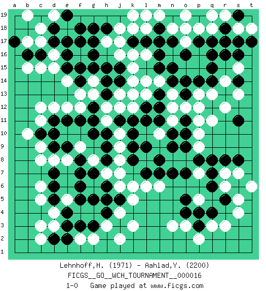 Last move : 1-0 2018 July 6 20:53:49 [Event "FICGS__GO__WCH_TOURNAMENT__000016"] [Site "FICGS"] [Date "2017.07.01"] [Round "1"] [Black "Lehnhoff,Heinz-Georg"] [White "Aahlad,Yeturu"] [Result "1-0"] [Rating 1 "1971"] [Rating 2 "2200"] 1.q16 d4 2.q4 d16 3.f3 c6 4.d2 c3 5.j3 r6 6.o4 s4 7.r8 r3 8.r5 s5 9.q6 p2 10.s6 o17 11.q14 k16 12.m17 p15 13.q15 q18 14.m15 r17 15.p17 p18 16.g16 k14 17.m13 k12 18.l11 f15 19.g15 g14 20.h14 g13 21.j15 l16 22.o16 p16 23.q17 n16 24.m16 l14 25.o18 o15 26.n17 m14 27.n14 n13 28.o13 n12 29.m12 o12 30.h13 h12 31.g12 f12 32.g11 h11 33.f11 e12 34.e11 d12 35.k11 j12 36.h10 j10 37.j11 j9 38.k13 j13 39.j14 l13 40.l12 k13 41.h9 m10 42.k9 j8 43.l9 j16 44.h8 j7 45.l7 f9 46.g10 h7 47.d11 k15 48.h15 h17 49.g17 c11 50.c10 c12 51.h18 j18 52.g18 n18 53.o16 l8 54.k8 o17 55.o14 k18 56.d18 o19 57.g7 g6 58.f6 r7 59.q7 c18 60.d17 c17 61.e16 d15 62.h6 g8 63.f7 l6 64.m8 j6 65.d9 e18 66.e17 j4 67.f18 g4 68.g5 f4 69.h4 h3 70.h5 k3 71.g3 j2 72.e4 m6 73.j5 k5 74.m18 m19 75.l19 l18 76.n19 n8 77.n9 m19 78.n15 o8 79.m7 k19 80.n7 f16 81.c16 c15 82.b16 b17 83.e15 e14 84.c19 b19 85.a17 d19 86.e19 r12 87.p12 p11 88.q12 q11 89.o11 n11 90.o10 p9 91.n10 s7 92.s8 t6 93.p8 s15 94.s14 s13 95.s16 r14 96.s17 q13 97.r18 p13 98.p14 s18 99.r16 r19 100.l17 t18 101.r17 q19 102.s19 o18 103.k17 j17 104.m11 p12 105.o16 e8 106.d7 p7 107.q8 b15 108.o9 d8 109.f8 c8 110.e9 b10 111.f17 p5 112.o5 g2 113.d5 e5 114.f5 c9 115.d10 o3 116.p3 q3 117.p4 n3 118.k10 p10 119.o7 k6 120.f14 f13 121.f15 d3 122.e3 c5 123.d6 f2 124.e2 c2 125.t17 l19 126.s11 1-0 Here are the names of the openings (joseki) played in the four corners : Corner d4 : d4 f3 Hoshi (Hwajeom, Seongjeom, Xingwei`) 4-4 Point. The star or hoshi (4-4) point, emphasizing influence at the potential expense of territory. Ikken Kakari (Hankan Keolch'im, Yi Gua`jiao~, 1-Space Low Approach). Black 2 is the standard approach move to the 4-4. Corner q4 : q4 r6 Hoshi (Hwajeom, Seongjeom, Xingwei`) 4-4 Point. The star or hoshi (4-4) point, emphasizing influence at the potential expense of territory. Ikken Kakari (Hankan Keolch'im, Yi Gua`jiao~, 1-Space Low Approach). White 2 is the standard approach move to the 4-4. Corner q16 : q16 o17 Hoshi (Hwajeom, Seongjeom, Xingwei`) 4-4 Point. The star or hoshi (4-4) point, emphasizing influence at the potential expense of territory. Ikken Kakari (Hankan Keolch'im, Yi Gua`jiao~, 1-Space Low Approach). White 2 is the standard approach move to the 4-4. Corner d16 : d16 g16 Hoshi (Hwajeom, Seongjeom, Xingwei`) 4-4 Point. The star or hoshi (4-4) point, emphasizing influence at the potential expense of territory. Niken Takagakari (Dukan Nop'dakeolch'im, E`r Gaojia, 2-Space High Approach). Black 2 is a light approach move. Rarely played in even games, Black 2 is typically employed in handicap games. White continues with 6-4 or 3-10. In Korean Sunjang Baduk White has a stone on 8-4. Player Black won this Go (weiqi, baduk) game. Follow this game move after move (download)For rectangular six in the corner, dame is necessary. (Anonymous) Art disturbs, science reassures. (Georges Braque, Le Jour et la Nuit)