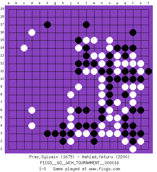 Last move : 1-0 2017 November 28 22:53:31 [Event "FICGS__GO__WCH_TOURNAMENT__000016"] [Site "FICGS"] [Date "2017.07.01"] [Round "1"] [Black "Praz,Sylvain"] [White "Aahlad,Yeturu"] [Result "1-0"] [Rating 1 "1679"] [Rating 2 "2200"] 1.r16 d16 2.q3 d4 3.f17 c14 4.l17 r9 5.r6 r12 6.r14 p12 7.q11 r13 8.q14 p13 9.f3 d6 10.k4 h3 11.h4 j4 12.j3 j5 13.h2 k3 14.g3 j2 15.h3 l3 16.l4 n3 17.m4 p3 18.q4 n4 19.k6 j6 20.n5 o5 21.n6 o6 22.o7 n7 23.l6 q6 24.o4 p4 25.q5 p7 26.o8 r7 27.s6 n8 28.o9 n9 29.o10 n10 30.o11 n12 31.n11 m11 32.o12 n13 33.o13 o14 34.p14 o15 35.r11 p11 36.q8 r8 37.q10 s11 38.s10 q9 39.p10 j8 40.m3 o3 41.m2 s12 42.r10 s9 43.t11 p5 44.m12 q2 45.r2 r3 46.s3 s2 47.r4 r1 48.r3 m13 49.l12 l11 50.k11 k14 51.k12 k9 52.l13 m15 53.l14 l15 54.k15 q12 55.q13 1-0 Here are the names of the openings (joseki) played in the four corners : Corner d16 : d16 f17 Hoshi (Hwajeom, Seongjeom, Xingwei`) 4-4 Point. The star or hoshi (4-4) point, emphasizing influence at the potential expense of territory. Ikken Kakari (Hankan Keolch'im, Yi Gua`jiao~, 1-Space Low Approach). Black 2 is the standard approach move to the 4-4. Corner q4 : q3 r9 Komoku (Somok, Xiao~mu`) 3-4 Point. The komoku (3-4) point is the traditional corner enclosure move.. Corner d4 : d4 f3 Hoshi (Hwajeom, Seongjeom, Xingwei`) 4-4 Point. The star or hoshi (4-4) point, emphasizing influence at the potential expense of territory. Ikken Kakari (Hankan Keolch'im, Yi Gua`jiao~, 1-Space Low Approach). Black 2 is the standard approach move to the 4-4. Player Black won this Go (weiqi, baduk) game. Follow this game move after move (download)The strong player plays straight, the weak diagonally. (Anonymous) You lose, general Kenobi. (General Grievous in Star Wars ep.3)