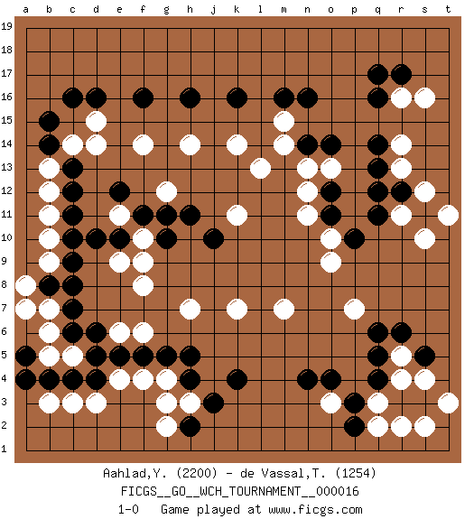 Last move : 1-0 2017 November 28 2:5:28 [Event "FICGS__GO__WCH_TOURNAMENT__000016"] [Site "FICGS"] [Date "2017.07.01"] [Round "1"] [Black "Aahlad,Yeturu"] [White "de Vassal,Thibault"] [Result "1-0"] [Rating 1 "2200"] [Rating 2 "1254"] 1.q16 d3 2.d16 r4 3.d5 c5 4.c6 b6 5.c4 b5 6.d4 c3 7.b4 b3 8.c7 b7 9.c8 b9 10.b8 a8 11.c10 b10 12.c11 b11 13.c12 g4 14.a4 b12 15.c13 b13 16.b14 c14 17.b15 d14 18.c9 a7 19.a5 d15 20.c16 f14 21.f16 e6 22.f5 f6 23.g5 f4 24.e5 e4 25.h5 f8 26.f11 h7 27.h4 h3 28.j3 g3 29.k4 o3 30.h11 k7 31.n4 m7 32.o4 h14 33.h16 k14 34.k16 l13 35.n16 k11 36.p3 p7 37.r12 r14 38.q14 r13 39.q13 s12 40.s11 r16 41.r17 s16 42.q17 r11 43.q12 s10 44.q11 t11 45.q5 r5 46.q6 q3 47.p2 q2 48.h2 g2 49.q4 o10 50.r3 r2 51.s3 s2 52.r6 s4 53.s5 t3 54.d6 o13 55.o11 n11 56.o12 n12 57.p10 o9 58.n14 n13 59.o14 m15 60.m16 m14 61.j10 f10 62.e10 e11 63.g10 f9 64.e12 g12 65.g11 e9 66.d10 1-0 Here are the names of the openings (joseki) played in the four corners : Corner d4 : d3 d5 Komoku (Somok, Xiao~mu`) 3-4 Point. The komoku (3-4) point is the traditional corner enclosure move.. Ikken Takagakari (Hankan Nop'dakeolch'im, Yi Gaogua`jiao~, 1-Space High Approach). The 5-4 approach move has become more popular in modern times, as modern Go emphasizes speed and influence. Corner q16 : q16 l13 Hoshi (Hwajeom, Seongjeom, Xingwei`) 4-4 Point. The star or hoshi (4-4) point, emphasizing influence at the potential expense of territory. Player Black won this Go (weiqi, baduk) game. Follow this game move after move (download)Take the cutting stone on the second line. (Anonymous) Pretend inferiority and encourage his arrogance. (Sun Tzu)