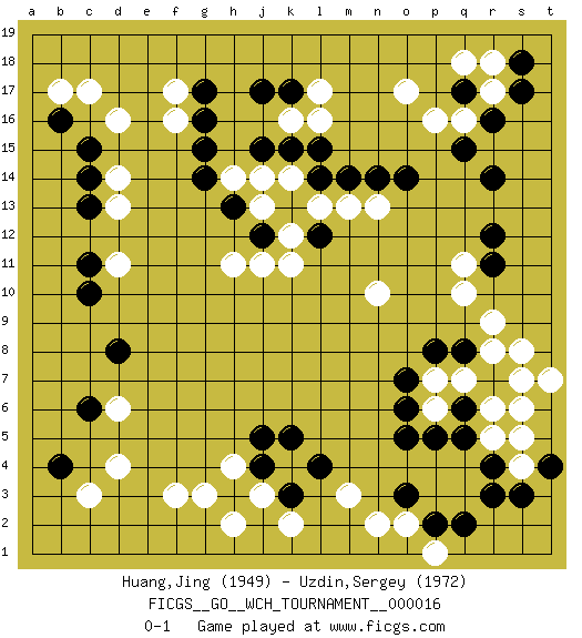 Last move : 0-1 2018 January 14 11:18:44 [Event "FICGS__GO__WCH_TOURNAMENT__000016"] [Site "FICGS"] [Date "2017.07.01"] [Round "1"] [Black "Huang,Jing"] [White "Uzdin,Sergey"] [Result "0-1"] [Rating 1 "1949"] [Rating 2 "1972"] 1.q17 d4 2.r4 d16 3.o3 q10 4.r14 l17 5.c14 f16 6.b16 c17 7.c11 k4 8.q8 o17 9.c6 f3 10.b4 c3 11.d8 m3 12.o5 r8 13.r7 r9 14.r11 q11 15.r12 q7 16.p8 r6 17.s7 s6 18.q6 p7 19.o7 p6 20.q5 s8 21.o6 t7 22.r7 s7 23.p5 s4 24.s3 r5 25.t4 s5 26.r3 n10 27.g16 f17 28.g15 d13 29.c13 d11 30.c10 q16 31.r16 r17 32.q15 p16 33.s17 r18 34.s18 q18 35.k17 k16 36.j17 l16 37.g17 d14 38.h13 h11 39.j12 j11 40.l12 k12 41.k13 k11 42.m14 j14 43.j15 k14 44.k15 h14 45.g14 l13 46.l15 m13 47.l14 j13 48.o14 n13 49.n14 n2 50.j4 j3 51.h3 h4 52.j5 h2 53.k3 g3 54.l4 k2 55.k5 o2 56.p2 p1 57.q2 b17 58.c15 d6 0-1 This go game has been lost on time (started : 2017.07.01 23:5:7) Here are the names of the openings (joseki) played in the four corners : Corner d16 : d16 c14 Hoshi (Hwajeom, Seongjeom, Xingwei`) 4-4 Point. The star or hoshi (4-4) point, emphasizing influence at the potential expense of territory. Ikken Kakari (Hankan Keolch'im, Yi Gua`jiao~, 1-Space Low Approach). Black 2 is the standard approach move to the 4-4. Corner d4 : d4 c6 Hoshi (Hwajeom, Seongjeom, Xingwei`) 4-4 Point. The star or hoshi (4-4) point, emphasizing influence at the potential expense of territory. Ikken Kakari (Hankan Keolch'im, Yi Gua`jiao~, 1-Space Low Approach). Black 2 is the standard approach move to the 4-4. Player White won this Go (weiqi, baduk) game. Follow this game move after move (download)Don't try to enclose an open skirt. (Anonymous) Cactus - It is depressed cucumber. (Ilmars Cirulis)