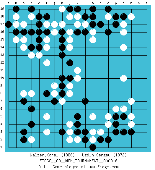Last move : 0-1 2017 September 5 9:31:40 [Event "FICGS__GO__WCH_TOURNAMENT__000016 "] [Site "FICGS"] [Date "2017.07.01"] [Round "1"] [Black "Walzer,Karel "] [White "Uzdin,Sergey "] [Result "0-1"] [Rating 1 "1386"] [Rating 2 "1972"] 1.d4 q16 2.q3 r5 3.q5 q6 4.p5 r4 5.r3 r7 6.d16 f3 7.h3 f5 8.d6 j4 9.k4 j3 10.k3 k2 11.l2 j2 12.k5 d2 13.c3 c8 14.c7 d8 15.c2 c14 16.d14 d13 17.e14 c15 18.c16 e13 19.h16 k17 20.o16 q14 21.p17 q17 22.l16 l17 23.m17 f17 24.e17 h17 25.f16 g16 26.f18 g17 27.k16 j16 28.h15 j15 29.h14 j14 30.h13 m16 31.n17 m15 32.p18 q10 33.q18 r18 34.m18 o18 35.l18 k18 36.k19 l19 37.j19 h19 38.m19 j18 39.o19 m3 40.l3 m5 41.n2 m2 42.m1 n3 43.o2 p6 44.l7 o5 45.p4 o4 46.p3 f14 47.e15 f15 48.e16 b17 49.b16 d18 50.e18 c17 51.b19 b18 52.d19 b15 53.a17 f12 54.j12 k10 55.j10 j9 56.h10 k11 57.h9 j8 58.h8 h7 59.g7 g8 60.f8 g9 0-1 Here are the names of the openings (joseki) played in the four corners : Corner q4 : q3 r5Komoku (Somok, Xiao~mu`) 3-4 Point. The komoku (3-4) point is the traditional corner enclosure move..Ikken Kakari (Hankan Keolch'im, Yi Gua`jiao~, 1-Space Low Pincer). The small knight move is the basic approach move to the 3-4 point stone. It has been continually used for over four centuries. There are limitless variations, with new moves constantly being discovered. White 2 opens the door to a treaure store of joseki. Corner d4 : d4 f3Hoshi (Hwajeom, Seongjeom, Xingwei`) 4-4 Point. The star or hoshi (4-4) point, emphasizing influence at the potential expense of territory.Ikken Kakari (Hankan Keolch'im, Yi Gua`jiao~, 1-Space Low Approach). White 2 is the standard approach move to the 4-4. Corner d16 : d16 c14Hoshi (Hwajeom, Seongjeom, Xingwei`) 4-4 Point. The star or hoshi (4-4) point, emphasizing influence at the potential expense of territory.Ikken Kakari (Hankan Keolch'im, Yi Gua`jiao~, 1-Space Low Approach). White 2 is the standard approach move to the 4-4. Corner q16 : q16 o16Hoshi (Hwajeom, Seongjeom, Xingwei`) 4-4 Point. The star or hoshi (4-4) point, emphasizing influence at the potential expense of territory.Ikken Takagakari (Hankan Nop'dakeolch'im, Yi Gaojia, 1-Space High Approach). White typically responds at 6-4 or 3-10. White 4-10 is played when White finds play on the right side advantageous. White 4-8 or 3-8 may be played when White has support at top. Player White won this Go (weiqi, baduk) game.Follow this game move after move (download ) If your stone is capped, play the knight's move. (Anonymous) The real voyage of discovery consists not in seeking new lands but in seeing with new eyes. (Marcel Proust)