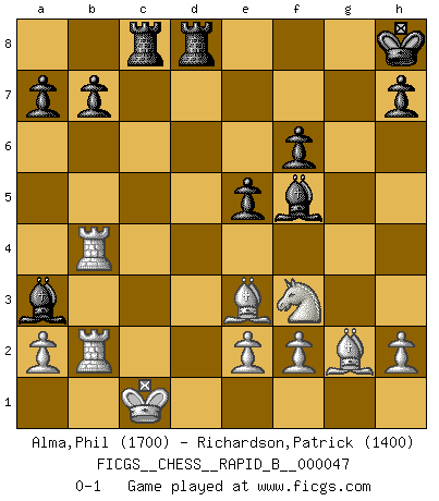 Last move : 0-1 2007 May 7 15:11:20 [Event "FICGS__CHESS__RAPID_B__000047"] [Site "FICGS"] [Date "2007.04.09"] [Round "1"] [White "Alma,Phil"] [Black "Richardson,Patrick"] [Result "0-1"] [WhiteElo "1700"] [BlackElo "1400"] 1.d4 Nf6 2.c4 e6 3.Nc3 Bb4 4.Qc2 d5 5.Nf3 O-O 6.g4 c5 7.g5 cxd4 8.gxf6 Qxf6 9.Bg5 Qg6 10.Qxg6 dxc3 11.Qxg7+ Kxg7 12.Kd1 cxb2 13.Rb1 f6 14.Be3 dxc4 15.Rxb2 Nc6 16.Rg1+ Kh8 17.Rg4 Rd8+ 18.Kc2 e5 19.Rxc4 Bf5 20.Kc1 Ba3 21.Bg2 Nb4 22.Rcxb4 Rac8+ 0-1 Nimzo-Indian : Classical, Noa variation Kingside Castling by player Black (move 5) Player Black won this chess game. Follow this game move after move (download)Fischer prefers to enter Chess history alone. (Miguel Najdorf) Lisa Lane, amerikanische Schachmeisterin, hatte Fischer einmal als stärksten lebenden Spieler bezeichnet. Antwort: Das ist richtig, aber Lisa Lane ist eigentlich nicht in der Lage, das zu beurteilen. (Robert James Fischer) Muchos jugadores de Ajedrez se sorprendían cuando después de la partida, Fischer explicaba con calma: 'Yo ya había analizado esta posibilidad' en una posición en la cual yo creía que no era posible de prever desde la apertura. (Mikhail Tal) Aidez vos pièces, elles vous aideront. (Paul Morphy) Beta. Software undergoes beta testing shortly before it's released. Beta is latin for still doesn't work. (Anonymous)