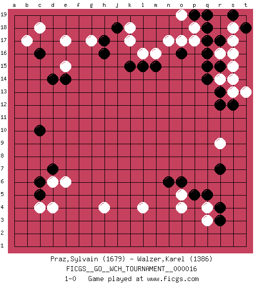Last move : 1-0 2017 August 16 11:51:44 [Event "FICGS__GO__WCH_TOURNAMENT__000016 "] [Site "FICGS"] [Date "2017.07.01"] [Round "1"] [Black "Praz,Sylvain "] [White "Walzer,Karel "] [Result "1-0"] [Rating 1 "1679"] [Rating 2 "1386"] 1.q16 d4 2.c16 q3 3.q5 o4 4.r3 q4 5.r4 e17 6.h16 e15 7.d14 c18 8.e14 g17 9.c6 d6 10.d7 e6 11.c5 c4 12.c10 h4 13.p5 o5 14.o6 l4 15.n6 r14 16.r12 r16 17.r17 s16 18.q15 s17 19.q18 s13 20.h17 b17 21.q14 r9 22.r15 s15 23.r13 s14 24.s12 s18 25.r7 m16 26.l15 l16 27.k15 k18 28.j18 p17 29.q17 p18 30.o16 n17 31.m15 k17 32.p19 o19 33.q19 o17 34.s19 t13 35.t18 1-0 Here are the names of the openings (joseki) played in the four corners : Corner q4 : q3 q5Komoku (Somok, Xiao~mu`) 3-4 Point. The komoku (3-4) point is the traditional corner enclosure move..Ikken Takagakari (Hankan Nop'dakeolch'im, Yi Gaogua`jiao~, 1-Space High Approach). The 5-4 approach move has become more popular in modern times, as modern Go emphasizes speed and influence. Corner d16 : c16 e17Komoku (Somok, Xiao~mu`) 3-4 Point. The komoku (3-4) point is the traditional corner enclosure move..Ikken Kakari (Hankan Keolch'im, Yi Gua`jiao~, 1-Space Low Pincer). The small knight move is the basic approach move to the 3-4 point stone. It has been continually used for over four centuries. There are limitless variations, with new moves constantly being discovered. White 2 opens the door to a treaure store of joseki. Corner d4 : d4 c6Hoshi (Hwajeom, Seongjeom, Xingwei`) 4-4 Point. The star or hoshi (4-4) point, emphasizing influence at the potential expense of territory.Ikken Kakari (Hankan Keolch'im, Yi Gua`jiao~, 1-Space Low Approach). Black 2 is the standard approach move to the 4-4. Corner q16 : q16 r14Hoshi (Hwajeom, Seongjeom, Xingwei`) 4-4 Point. The star or hoshi (4-4) point, emphasizing influence at the potential expense of territory.Ikken Kakari (Hankan Keolch'im, Yi Gua`jiao~, 1-Space Low Approach). White 2 is the standard approach move to the 4-4. Player Black won this Go (weiqi, baduk) game.Follow this game move after move (download ) Conservative and slow will win. Believe it ! (Anonymous) Nothing is more important for teaching us to understand the concepts we have than constructing fictitious ones. (Ludwig Wittgenstein)
