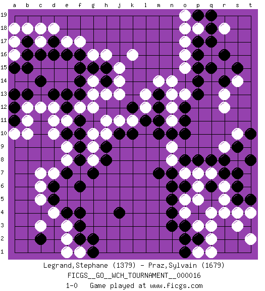 Last move : 1-0 2018 March 15 12:0:35 [Event "FICGS__GO__WCH_TOURNAMENT__000016"] [Site "FICGS"] [Date "2017.07.01"] [Round "1"] [Black "Legrand,Stephane"] [White "Praz,Sylvain"] [Result "1-0"] [Rating 1 "1379"] [Rating 2 "1679"] 1.q17 d4 2.d16 r4 3.p4 r15 4.q6 p3 5.o3 q3 6.n4 o16 7.p16 o17 8.p14 o15 9.p15 r12 10.r16 r18 11.r14 r9 12.q18 k16 13.f3 c6 14.j4 f17 15.c14 r6 16.r7 q7 17.q8 p7 18.r8 o5 19.s6 r5 20.p8 o7 21.o8 o4 22.n7 p5 23.n5 q4 24.o12 n8 25.m7 n9 26.o10 s14 27.s15 r13 28.q15 s8 29.s7 s10 30.t8 t9 31.s9 c17 32.d17 d18 33.c16 b18 34.b17 c18 35.t10 c12 36.f16 e17 37.e16 g16 38.g15 h16 39.e12 d10 40.e10 e9 41.f10 d11 42.f9 e8 43.f8 n11 44.o11 j13 45.k12 g14 46.f14 g13 47.h15 j15 48.h14 h13 49.f6 h11 50.j10 j11 51.k10 e11 52.f11 f12 53.b13 b12 54.f13 g12 55.d13 k11 56.l11 h10 57.h9 l12 58.m12 l13 59.e7 d7 60.d6 c7 61.a12 b11 62.m11 n14 63.m13 m14 64.o2 e2 65.f2 p18 66.p19 o19 67.q19 e3 68.f4 o13 69.p13 g9 70.h8 f1 71.g1 e1 72.g2 g8 73.g7 g10 74.d5 c5 75.e4 c3 76.p2 q2 77.t3 s3 78.b15 n12 79.n10 n13 80.m10 a17 81.a11 a10 82.a13 b10 83.b16 j14 84.f15 t4 85.t5 t2 86.p17 o18 87.s5 p1 88.n3 d12 89.e13 s4 90.o1 q1 91.n6 a16 92.a15 a18 93.o6 p6 94.c2 1-0 Here are the names of the openings (joseki) played in the four corners : Corner q4 : r4 p4 Komoku (Somok, Xiao~mu`) 3-4 Point. The komoku (3-4) point is the traditional corner enclosure move.. Ikken Takagakari (Hankan Nop'dakeolch'im, Yi Gaogua`jiao~, 1-Space High Approach). The 5-4 approach move has become more popular in modern times, as modern Go emphasizes speed and influence. Corner q16 : q17 r15 Komoku (Somok, Xiao~mu`) 3-4 Point. The komoku (3-4) point is the traditional corner enclosure move.. Ikken Kakari (Hankan Keolch'im, Yi Gua`jiao~, 1-Space Low Pincer). The small knight move is the basic approach move to the 3-4 point stone. It has been continually used for over four centuries. There are limitless variations, with new moves constantly being discovered. White 2 opens the door to a treaure store of joseki. Corner d4 : d4 f3 Hoshi (Hwajeom, Seongjeom, Xingwei`) 4-4 Point. The star or hoshi (4-4) point, emphasizing influence at the potential expense of territory. Ikken Kakari (Hankan Keolch'im, Yi Gua`jiao~, 1-Space Low Approach). Black 2 is the standard approach move to the 4-4. Corner d16 : d16 f17 Hoshi (Hwajeom, Seongjeom, Xingwei`) 4-4 Point. The star or hoshi (4-4) point, emphasizing influence at the potential expense of territory. Ikken Kakari (Hankan Keolch'im, Yi Gua`jiao~, 1-Space Low Approach). White 2 is the standard approach move to the 4-4. Player Black won this Go (weiqi, baduk) game. Follow this game move after move (download)The weak player fears ko, the strong player seeks it. (Bill Taylor) Mandala - that's it! 16x16 squares as multiple of the four and the eight because of the Four Noble Truths and the Noble Eightfold Path. (Heinz-Georg Lehnhoff about Big Chess)