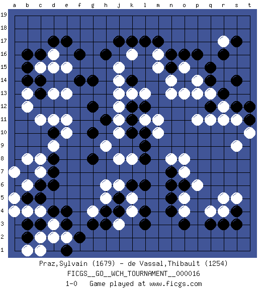 Last move : 1-0 2017 November 22 16:32:55 [Event "FICGS__GO__WCH_TOURNAMENT__000016"] [Site "FICGS"] [Date "2017.07.01"] [Round "1"] [Black "Praz,Sylvain"] [White "de Vassal,Thibault"] [Result "1-0"] [Rating 1 "1679"] [Rating 2 "1254"] 1.r16 c4 2.c16 r4 3.e17 c11 4.p16 r11 5.o3 j3 6.e4 o5 7.l3 k4 8.r3 q4 9.q3 p11 10.d6 b6 11.l4 j6 12.l6 n8 13.c3 d3 14.d4 d2 15.b7 b4 16.c13 e11 17.d10 d11 18.g3 j8 19.l8 e10 20.g8 k8 21.l9 j10 22.g10 c7 23.c6 b8 24.d7 c8 25.g12 j12 26.l12 j13 27.g14 j15 28.k14 j14 29.j17 k16 30.m17 m16 31.n16 m15 32.l17 l13 33.r13 p13 34.q12 q11 35.s12 s11 36.s4 s5 37.s3 r5 38.e3 e2 39.f2 c2 40.n15 n14 41.o14 n13 42.h16 b12 43.n7 o7 44.n6 o8 45.j5 k5 46.k6 h6 47.h4 h5 48.j4 g4 49.h3 e13 50.b15 e15 51.f16 d16 52.d17 c15 53.c14 d15 54.b16 b13 55.b14 o13 56.b5 a7 57.c5 a5 58.b3 a4 59.b2 b1 60.e1 c1 61.h11 j11 62.f14 d13 63.d8 d9 64.n5 o4 65.n4 m10 66.l10 l11 67.k11 m11 68.k10 h9 69.k12 k13 70.o6 p6 71.t11 t10 72.t12 s9 73.k17 p14 74.q15 r17 75.s17 r12 76.s14 o15 77.o16 q13 78.q14 1-0 Here are the names of the openings (joseki) played in the four corners : Corner q4 : r4 o3 Komoku (Somok, Xiao~mu`) 3-4 Point. The komoku (3-4) point is the traditional corner enclosure move.. Niken Kakari (Dukan Keolch'im, E`r Gua`jiao~, 2-Space Low Approach). Black 2 is used with friendly forces backing it up. Its purpose is to prevent a pincer. Locally it results in a loss, but may be appropriate fuseki strategy. It was popular in the late 1950s and early 1960s, but is not seen often nowadays, having been replaced by the one-space high approach, with which it has points in common. Player Black won this Go (weiqi, baduk) game. Follow this game move after move (download)Knight's moves win running battles. (Anonymous) May I never be complete. May I never be content. May I never be perfect. Deliver me, Tyler, from being perfect and complete. (Chuck Palahniuk, Fight Club)