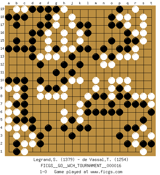 Last move : 1-0 2018 March 1 22:15:56 [Event "FICGS__GO__WCH_TOURNAMENT__000016"] [Site "FICGS"] [Date "2017.07.01"] [Round "1"] [Black "Legrand,Stephane"] [White "de Vassal,Thibault"] [Result "1-0"] [Rating 1 "1379"] [Rating 2 "1254"] 1.r17 d3 2.q4 d17 3.d15 c15 4.d16 c16 5.e17 d18 6.d14 e18 7.f17 q17 8.q16 r16 9.p17 q18 10.r18 p18 11.q15 s16 12.o17 s18 13.o18 r19 14.d5 k16 15.c14 h16 16.f4 c4 17.c5 b4 18.e2 b6 19.b5 a5 20.c7 b8 21.b7 a7 22.c6 a6 23.c8 b9 24.a8 a9 25.c10 c2 26.l4 h6 27.h4 k6 28.m6 l8 29.n8 k10 30.k12 h11 31.h12 g17 32.j11 j10 33.g11 f16 34.h10 h9 35.g9 h8 36.e16 m10 37.f18 g18 38.g19 h19 39.f19 j18 40.b17 c17 41.b18 b16 42.b14 c19 43.a16 a15 44.a18 a17 45.e19 a16 46.d19 b19 47.b15 o10 48.q7 q10 49.p9 p10 50.n14 o9 51.l17 r14 52.k17 j17 53.l16 k15 54.q14 r13 55.p3 r8 56.r7 s8 57.s7 t7 58.t6 t8 59.s5 q13 60.e3 d2 61.d4 p13 62.l14 f15 63.a14 f13 64.c18 g8 65.f9 o14 66.o15 n13 67.p14 j4 68.j5 k5 69.k4 h5 70.j3 o8 71.o7 n7 72.o6 m7 73.o13 o12 74.m13 n12 75.b10 f8 76.g14 f14 77.b2 b3 78.b1 c1 79.e12 e8 80.c9 a4 81.l6 r3 82.q2 r2 83.l7 k7 84.m8 m9 85.n6 s4 86.r4 t3 87.s2 p7 88.p6 s1 89.t2 h15 90.r15 s15 91.a10 e9 92.e10 e13 93.d13 g13 94.p19 s17 95.k14 j14 96.j13 h14 97.q8 q9 98.p8 1-0 Here are the names of the openings (joseki) played in the four corners : Corner d16 : d17 d15 Komoku (Somok, Xiao~mu`) 3-4 Point. The komoku (3-4) point is the traditional corner enclosure move.. Ikken Takagakari (Hankan Nop'dakeolch'im, Yi Gaogua`jiao~, 1-Space High Approach). The 5-4 approach move has become more popular in modern times, as modern Go emphasizes speed and influence. Corner q16 : r17 q17 San-San (Sam-Sam, San-San) 3-3 Point. The San-San (3-3) point, emphasizing territory at the expense of influence. This move is not recommended. White should envisage 4-4, 5-3, 6-4, 5-4 or 6-3 instead. Corner d4 : d3 d5 Komoku (Somok, Xiao~mu`) 3-4 Point. The komoku (3-4) point is the traditional corner enclosure move.. Ikken Takagakari (Hankan Nop'dakeolch'im, Yi Gaogua`jiao~, 1-Space High Approach). The 5-4 approach move has become more popular in modern times, as modern Go emphasizes speed and influence. Player Black won this Go (weiqi, baduk) game. Follow this game move after move (download)Dead group ? Always win ko fights ! (Anonymous) It is not true that people stop pursuing dreams because they grow old, they grow old because they stop pursuing dreams. (Gabriel Garcia Marquez)