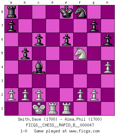 Last move : 1-0 2007 April 27 19:18:11 [Event "FICGS__CHESS__RAPID_B__000047"] [Site "FICGS"] [Date "2007.04.09"] [Round "1"] [White "Smith,Dave"] [Black "Alma,Phil"] [Result "1-0"] [WhiteElo "1700"] [BlackElo "1700"] 1.e4 c6 2.d4 d5 3.Nc3 dxe4 4.Nxe4 Bf5 5.Ng3 Bg6 6.h4 h6 7.Nf3 Nf6 8.Ne5 Bh7 9.Bd3 Qxd4 10.Nxf7 Bxd3 11.Nxh8 Qe5+ 12.Be3 Ba6 13.Qd8+ Kxd8 14.Nf7+ Ke8 15.Nxe5 e6 16.O-O-O Nbd7 17.Nxd7 Nxd7 18.Rhe1 b6 19.Bf4 Bc4 20.Bd6 b5 21.Bxf8 Nxf8 22.Nf5 1-0 Caro-Kann : Classical, 6.h4 Queenside Castling by player White (move 16) Player White won this chess game. Follow this game move after move (download)Alekhine is a poet who creates a work of art out of something that would hardly inspire another man to send home a picture post card. (Max Euwe) Ich verstehe mehr vom Schach als irgendein anderer lebender Meister. (José Raúl Capablanca) ¿Esta Bobby Fischer algo cuerdo?. (Salo Flohr) Le jeu d'échecs est comme rejeté hors du temps. (Antoine de Saint-Exupéry) Pretend inferiority and encourage his arrogance. (Sun Tzu)