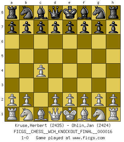 Last move : 1-0 2017 August 1 1:0:16 [Event "FICGS__CHESS__WCH_KNOCKOUT_FINAL__000016"] [Site "FICGS"] [Date "2017.07.01"] [Round "5"] [White "Kruse,Herbert"] [Black "Ohlin,Jan"] [Result "1-0"] [WhiteElo "2435"] [BlackElo "2424"] 1.c4 1-0 This chess game has been lost on time (started : 2017.07.01 23:20:13) English Opening Player White won this chess game. Follow this game move after move (download)The stomach is an essential part of the Chess master. (Bent Larsen) Im Wettkampf zwischen starken Meistern kommen Fehler sehr selten vor, deshalb ist es mit bloßem Warten nicht getan. (José Raúl Capablanca) La táctica fluye a partir de una posición superior. (Bobby Fischer) Demandez au pauvre Cg1 ce qu'il en pense. Eduard Gufeld à propos de la variante Saemisch de l'Est-Indienne. It is not enough to be a good player... you must also play well. (Siegbert Tarrasch)