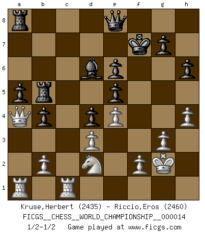 Last move : 1/2-1/2 2017 September 29 17:42:4 [Event "FICGS__CHESS__WORLD_CHAMPIONSHIP__000014"] [Site "FICGS"] [Date "2017.07.03"] [Round "2"] [White "Kruse,Herbert"] [Black "Riccio,Eros"] [Result "1/2-1/2"] [WhiteElo "2435"] [BlackElo "2460"] 1.e4 e5 2.Nf3 Nc6 3.Bb5 a6 4.Ba4 Nf6 5.d3 b5 6.Bb3 Be7 7.a4 b4 8.a5 O-O 9.O-O d6 10.Nbd2 Be6 11.Bxe6 fxe6 12.Re1 d5 13.h3 Qd6 14.Qe2 Nd7 15.Nb3 Bf6 16.c3 Rab8 17.Qc2 Nc5 18.Nxc5 Qxc5 19.Re2 Rb5 20.Be3 Qd6 21.c4 dxc4 22.Qxc4 Nxa5 23.Qc2 c5 24.R2e1 Rd8 25.Red1 Be7 26.g3 Ra8 27.Rdc1 Nc6 28.h4 Qd7 29.Kg2 h6 30.Qc4 Na5 31.Qc2 Nc6 32.Nd2 a5 33.Qb3 Rb6 34.Ra4 Nd4 35.Bxd4 cxd4 36.Nc4 Rb5 37.R4a1 Qe8 38.Nd2 Bd6 39.Qa4 Kf7 40.Nc4 Bc7 41.Nd2 Bd6 42.Nc4 Bc7 43.Nd2 Bd6 1/2-1/2 Ruy Lopez : Anderssen variation Kingside Castling by player Black (move 8) Kingside Castling by player White (move 9) This chess game ended in a draw. Follow this game move after move (download)One doesn't have to play well, it's enough to play better than your opponent. (Siegbert Tarrasch) Nie in meinem Leben habe ich die französische Verteidigung gespielt, welche die Stumpfsinnigste von allen ist. (Wilhelm Steinitz) A la fecha, Fischer esta simplemente un nivel arriba de todos los mejores jugadores de Ajedrez del mundo. (John Jacobs) Les Echecs ont trois composantes : le temps, l'espace et le matériel en dernier. (Mikhail Tal) If you work for a living, why do you kill yourself working ? (Tuco to a chicken in The Good, The Bad and The Ugly)
