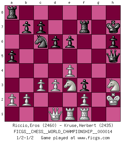 Last move : 1/2-1/2 2017 September 22 15:4:16 [Event "FICGS__CHESS__WORLD_CHAMPIONSHIP__000014"] [Site "FICGS"] [Date "2017.07.03"] [Round "9"] [White "Riccio,Eros"] [Black "Kruse,Herbert"] [Result "1/2-1/2"] [WhiteElo "2460"] [BlackElo "2435"] 1.e4 e5 2.Nf3 Nc6 3.Bc4 Nf6 4.d3 Bc5 5.c3 d6 6.O-O O-O 7.Re1 h6 8.h3 a5 9.Nbd2 Be6 10.Bxe6 fxe6 11.Nb3 Ba7 12.Be3 Nh5 13.Nbd2 Nf4 14.Qc2 Qe8 15.Kh2 Qh5 16.Rf1 g5 17.Bxa7 Rxa7 18.Ng1 g4 19.Nc4 R7a8 20.Ne3 gxh3 21.g3 Kh7 22.Rae1 Rf7 23.gxf4 exf4 24.Qd1 f3 25.Nxh3 Qe5+ 26.Kh1 Qh5 27.Kh2 Qe5+ 28.Kh1 Qh5 29.Kh2 1/2-1/2 Two knights defense (Modern Bishop's Opening) Kingside Castling by player White (move 6) Kingside Castling by player Black (move 6) This chess game ended in a draw. Follow this game move after move (download)A Chess game is a dialogue, a conversation between a player and his opponent. Each move by the opponent may contain threats or be a blunder, but a player cannot defend against threats or take advantage of blunders if he does not first ask himself: What is my opponent planning after each move ? (Bruce A. Moon) Ich bin der einzige Schachspieler, der sich während der Vorbereitungen zum Turnier verletzt hat. (Woody Allen) No hay un Gran Maestro de Ajedrez que sea normal; solo se diferencían ellos por la magnitud de su locura. (Viktor Korchnoi) Vous savez, camarade Pachman, je n'éprouve pas de plaisir à être ministre, je jouerais plutôt aux échecs comme vous, ou alors ferais une révolution au Venezuela. (Che Guevara à Ludek Pachman, 'Checkmate in Prague', 1975) All art requires courage. (Anne Tucker)