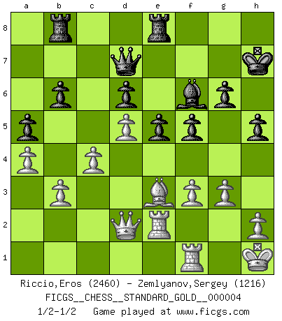 Last move : 1/2-1/2 2017 August 24 23:26:4 [Event "FICGS__CHESS__STANDARD_GOLD__000004"] [Site "FICGS"] [Date "2017.07.03"] [Round "1"] [White "Riccio,Eros"] [Black "Zemlyanov,Sergey"] [Result "1/2-1/2"] [WhiteElo "2460"] [BlackElo "1216"] 1.e4 c5 2.Nf3 d6 3.d4 cxd4 4.Nxd4 Nf6 5.Nc3 a6 6.Be3 e5 7.Nb3 Be6 8.f3 h5 9.Qd2 Nbd7 10.Nd5 Bxd5 11.exd5 g6 12.Be2 Bg7 13.O-O b6 14.c4 O-O 15.Rae1 Re8 16.Kh1 Rc8 17.Qd1 a5 18.a4 Rb8 19.Bg5 Nc5 20.Qc2 Nxb3 21.Qxb3 Qc7 22.Bd3 Nd7 23.Qc2 Nc5 24.b3 Qd7 25.Qb1 Nxd3 26.Qxd3 Kh7 27.Qd2 f6 28.Be3 f5 29.g3 Bf6 30.Re2 1/2-1/2 Sicilian : Najdorf, Byrne (English) attack Kingside Castling by player White (move 13) Kingside Castling by player Black (move 14) This chess game ended in a draw. Follow this game move after move (download)It is not a move, even the best move that you must seek, but a realizable plan. (Eugene Znosko-Borovsky) Herr Iljumschinow ist ein etwas merkwürdiger Geschäftsmann: Er arbeitet zusammen mit Leuten wie Muammar al-Gaddafi; früher ist das Saddam Hussein gewesen. (Joel Lautier) Todos los Maestros de Ajedrez fueron un día unos principiantes. (Chernev) L'action d'une oeuvre littéraire se déroule sur un champ de bataille. Les masques et les types du drame moderne correspondent aux pièces du jeu d'échecs. L'intrigue correspond aux coups et aux gambits, c'est à dire aux techniques du jeu telles qu'utilisées et interprétées par les joueurs. Les tactiques et les péripéties [mouvements] correspondent aux coups exécutés par l'adversaire. (Viktor Shklovsky) Somewhere in the world there is an epigram for every dilemma. (Hendrik Willem van Loon)