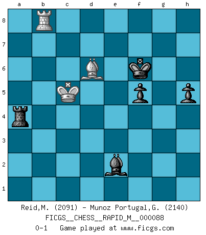 Last move : 0-1 2017 October 25 18:34:36 [Event "FICGS__CHESS__RAPID_M__000088"] [Site "FICGS"] [Date "2017.07.05"] [Round "1"] [White "Reid,Malcolm"] [Black "Munoz Portugal,Guillermo"] [Result "0-1"] [WhiteElo "2091"] [BlackElo "2140"] 1.e4 e5 2.Nf3 Nf6 3.Nxe5 d6 4.Nf3 Nxe4 5.Nc3 Nxc3 6.dxc3 Nd7 7.Be3 Be7 8.Bd3 O-O 9.Qd2 c6 10.O-O-O d5 11.Kb1 Re8 12.h4 a5 13.g4 a4 14.a3 Nf6 15.g5 Ne4 16.Bxe4 dxe4 17.Qe2 Qa5 18.Nd4 Qa6 19.c4 Bd7 20.h5 Ra8d8 21.g6 Bf6 22.Rdg1 Qa5 23.c3 fxg6 24.hxg6 h6 25.Ka1 Bc8 26.Re1 Bd7 27.Rd1 Bc8 28.Rdg1 c5 29.Nb5 Qb6 30.Rh5 Be5 31.Qc2 Qe6 32.Qxe4 b6 33.Na7 Bd7 34.Qd5 Bf6 35.Nb5 Qxd5 36.Rxd5 Bc6 37.Nc7 Re4 38.Rxd8+ Bxd8 39.Nd5 Rxc4 40.Rd1 Rh4 41.b3 axb3 42.Kb2 Be8 43.Nb4 Bf6 44.Nd5 Bxg6 45.Nxf6+ gxf6 46.Kxb3 Kg7 47.Rd6 Rh1 48.Kc4 Rb1 49.Kd5 Bf5 50.f3 h5 51.Bf2 Kf7 52.Kc6 Be6 53.a4 Rb2 54.Be1 Re2 55.Rd1 Bb3 56.Ra1 Re6 57.Kb5 Bd5 58.c4 Bxf3 59.Bg3 f5 60.Ra3 Bg4 61.Rd3 Kg6 62.Rd8 Be2 63.Rg8+ Kf7 64.Rb8 Re4 65.Bd6 Rxc4 66.Kxb6 Rxa4 67.Kxc5 Kf6 0-1 Petrov : Nimzovich attack Kingside Castling by player Black (move 8) Queenside Castling by player White (move 10) 10 pieces endgame at move 66 : White KRBP , Black KRBPPP WHITE : King + 1 Rook 1 Bishop 1 Pawn BLACK : King + 1 Rook 1 Bishop 3 Pawns 9 pieces endgame at move 66 : White KRB , Black KRBPPP WHITE : King + 1 Rook 1 Bishop BLACK : King + 1 Rook 1 Bishop 3 Pawns 8 pieces endgame at move 67 : White KRB , Black KRBPP WHITE : King + 1 Rook 1 Bishop BLACK : King + 1 Rook 1 Bishop 2 Pawns Player Black won this chess game. Follow this game move after move (download)We must make sure that Chess will not be like a dead language, very interesting, but for a very small group. (Sytze Faber) Schach ist mein Leben, meine Leidenschaft, was ich gelernt habe und seit meinem 14. Lebensjahr profimässig praktiziere. Darauf zu verzichten, würde mir sehr schwer fallen. (Viktor Kortschnoi) Cuando tu no sabes absolutamente que mas hacer, es tiempo de entrar en pánico. (John van der Wiel) Aux échecs, les retours au sommet sont rares : les dommages psychologiques consécutifs à une défaite sont trop sévères. (Daily Telegraph) The existence of forgetting has never been proved: We only know that some things don't come to mind when we want them. (Friedrich Nietzsche)