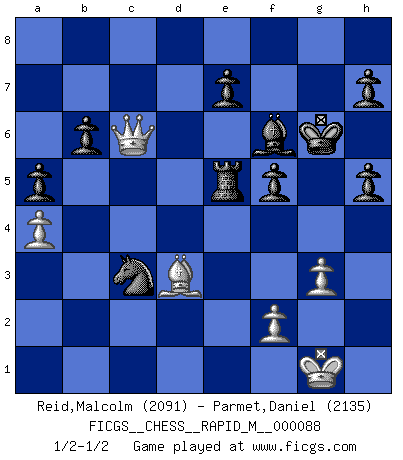Last move : 1/2-1/2 2017 August 28 6:7:46 [Event "FICGS__CHESS__RAPID_M__000088"] [Site "FICGS"] [Date "2017.07.05"] [Round "1"] [White "Reid,Malcolm"] [Black "Parmet,Daniel"] [Result "1/2-1/2"] [WhiteElo "2091"] [BlackElo "2135"] 1.Nf3 Nf6 2.g3 g6 3.b4 Bg7 4.Bb2 O-O 5.Bg2 a5 6.b5 d5 7.O-O Nbd7 8.c4 c6 9.a4 Re8 10.d4 Nb6 11.Nfd2 Nxc4 12.Nxc4 dxc4 13.Na3 Be6 14.Rb1 Rc8 15.e4 c3 16.Bxc3 cxb5 17.Nxb5 Bc4 18.e5 Bxf1 19.Bxf1 Nd5 20.Bd2 b6 21.Bh3 Rc6 22.Na7 Rc4 23.Qb3 Rxd4 24.Nc6 Rxd2 25.Nxd8 Rxd8 26.e6 f5 27.Rd1 Rd4 28.Bf1 Bf6 29.h4 Rd6 30.h5 Kg7 31.Qf3 Rxd1 32.Qxd1 Nc3 33.Qc1 gxh5 34.Qf4 Kg6 35.Qf3 Rxe6 36.Bd3 Re5 37.Qc6 1/2-1/2 Reti : King's Indian attack, Reti-Smyslov variation Kingside Castling by player Black (move 4) Kingside Castling by player White (move 7) This chess game ended in a draw. Follow this game move after move (download)Via the squares on the chessboard, the Indians explain the movement of time and the age, the higher influences which control the world and the ties which link Chess with the human soul. (Al-Masudi) Charakterschwächen offenbaren sich normalerweise während einer Schachpartie. (Garry Kasparov) No hay precio que sea tan grande por la cabellera del Rey enemigo. (Koblentz) Les Echecs représentent une sphère d'idées créatrices basée sur la volonté des deux protagonistes. (Smyslov) Always be a first-rate version of yourself, instead of a second-rate version of somebody else. (Judy Garland)