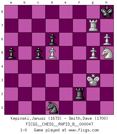 Last move : 1-0 2007 July 1 20:12:8 [Event "FICGS__CHESS__RAPID_B__000047"] [Site "FICGS"] [Date "2007.04.09"] [Round "1"] [White "Kepinski,Janusz"] [Black "Smith,Dave"] [Result "1-0"] [WhiteElo "1673"] [BlackElo "1700"] 1.d4 Nf6 2.c4 d6 3.e3 g6 4.Bd3 Bg7 5.Nc3 O-O 6.Nge2 c6 7.O-O c5 8.b3 Nfd7 9.d5 Ne5 10.Bc2 f5 11.e4 Bd7 12.exf5 Bxf5 13.Bxf5 gxf5 14.Nf4 Qa5 15.Bd2 Nxc4 16.bxc4 Bxc3 17.Bxc3 Qxc3 18.Ne6 Rc8 19.Qh5 Qf6 20.Rab1 Nd7 21.Rb3 f4 22.Qg4+ Kh8 23.Rxb7 Ne5 24.Qxf4 Rg8 25.Rfb1 Qxf4 26.Nxf4 Nxc4 27.Rxe7 Rab8 28.Rxb8 Rxb8 29.g3 a5 30.h4 Kg8 31.h5 Rb1+ 32.Kg2 Ra1 33.h6 Rxa2 34.Nh5 Kf8 35.Rxh7 Ne3+ 36.Kf3 Nd1 37.g4 Rxf2+ 38.Kg3 Kg8 39.Rg7+ Kh8 40.g5 1-0 Old Indian defense Kingside Castling by player Black (move 5) Kingside Castling by player White (move 7) Player White won this chess game. Follow this game move after move (download)You need not play well - just help your opponent to play badly. (Genrikh Chepukaitis) Smyslow ist ein Beweis dafür, dass ich noch zehn Jahre spielen kann! [der 75 jährige über den 85 jährigen] (Viktor Kortschnoi) El juego de Fischer siempre fue nítido, racional y brillante. Uno de los mejores por siempre. (Dave Regis) Les Echecs représentent une sphère d'idées créatrices basée sur la volonté des deux protagonistes. (Smyslov) Hold em is to stud what chess is to checkers. (Johnny Moss)