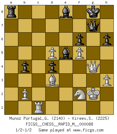 Last move : 1/2-1/2 2017 August 31 2:53:21 [Event "FICGS__CHESS__RAPID_M__000088"] [Site "FICGS"] [Date "2017.07.05"] [Round "1"] [White "Munoz Portugal,Guillermo"] [Black "Kireev,Sergey"] [Result "1/2-1/2"] [WhiteElo "2140"] [BlackElo "2225"] 1.d4 d5 2.c4 c6 3.Nf3 Nf6 4.cxd5 cxd5 5.Nc3 Nc6 6.Bf4 Bf5 7.Qb3 Na5 8.Qa4 Bd7 9.Qc2 e6 10.e3 Rc8 11.Bd3 Be7 12.h3 b5 13.a3 O-O 14.O-O a6 15.Ra1b1 Nc4 16.Rf1c1 a5 17.Qe2 b4 18.axb4 axb4 19.Nd1 Qb6 20.Ra1 Qb7 21.Ne5 Nxe5 22.Bxe5 Rxc1 23.Rxc1 Rd8 24.g4 Ne4 25.f3 Nd6 26.Kg2 Ra8 27.Nf2 h6 28.f4 f6 29.Bxd6 Bxd6 30.g5 Be8 31.gxf6 gxf6 32.Qg4 Qg7 33.f5 e5 34.e4 exd4 35.exd5 Be5 1/2-1/2 QGD Slav : Exchange variation, 6.Bf4 Bf5 Kingside Castling by player Black (move 13) Kingside Castling by player White (move 14) This chess game ended in a draw. Follow this game move after move (download)The Pawns are the soul of the game. (Francois Andre Danican Philidor) Lisa Lane, amerikanische Schachmeisterin, hatte Fischer einmal als stärksten lebenden Spieler bezeichnet. Antwort: Das ist richtig, aber Lisa Lane ist eigentlich nicht in der Lage, das zu beurteilen. (Robert James Fischer) Repentinamente, me resultaba obvio en mi analisis que yo había pasado por alto lo que Fischer había visto en el tablero con la mas grande facilidad. (Mikhail Botvinnik) Il (Jacob Murray) ne joue pas pour le bon coup, mais pour le meilleur. (Eloi Relange) A bird doesn't sing because it has an answer, it sings because it has a song. (Maya Angelou)