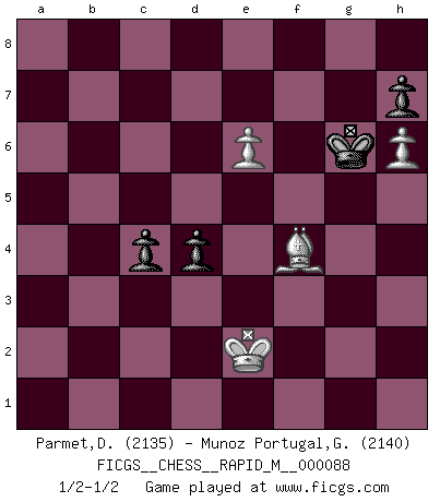 Last move : 1/2-1/2 2017 September 21 7:18:40 [Event "FICGS__CHESS__RAPID_M__000088"] [Site "FICGS"] [Date "2017.07.05"] [Round "1"] [White "Parmet,Daniel"] [Black "Munoz Portugal,Guillermo"] [Result "1/2-1/2"] [WhiteElo "2135"] [BlackElo "2140"] 1.e4 c6 2.d4 d5 3.e5 Bf5 4.Nf3 e6 5.Be2 c5 6.Be3 Qb6 7.Nc3 Qxb2 8.Qb1 Qxb1 9.Rxb1 c4 10.Rxb7 Nc6 11.Nb5 Nd8 12.Rc7 Rb8 13.Nd6+ Bxd6 14.exd6 Rb1 15.Bd1 Bxc2 16.Kd2 Bxd1 17.Rxd1 Rb6 18.Bf4 Nf6 19.Re7+ Kf8 20.Rxa7 Ne4 21.Kc2 f6 22.h4 Rb7 23.Rxb7 Nxb7 24.Rb1 Nd8 25.a4 Ke8 26.a5 Rf8 27.d7+ Kxd7 28.a6 Nc6 29.Rb7+ Ke8 30.a7 Nxa7 31.Rxa7 Nxf2 32.Rxg7 Rf7 33.Rg8+ Rf8 34.Rxf8+ Kxf8 35.h5 Kf7 36.Kd2 Ke8 37.Ke2 Ne4 38.g4 Ke7 39.g5 Kf7 40.h6 fxg5 41.Nxg5+ Nxg5 42.Bxg5 Kg6 43.Bf4 e5 44.dxe5 d4 45.e6 1/2-1/2 Caro-Kann : Advance variation 10 pieces endgame at move 41 : White KBPP , Black KNPPPP WHITE : King + 1 Bishop 2 Pawns BLACK : King + 1 Knight 4 Pawns 9 pieces endgame at move 42 : White KBPP , Black KPPPP WHITE : King + 1 Bishop 2 Pawns BLACK : King + 4 Pawns 8 pieces endgame at move 44 : White KBPP , Black KPPP WHITE : King + 1 Bishop 2 Pawns BLACK : King + 3 Pawns This chess game ended in a draw. Follow this game move after move (download)There are tough players and nice guys, and I'm a tough player. (Bobby Fischer) Kann Schach nicht schließlich das Nationalspiel der Deutschen werden? Und welche weiteren Ausblicke bieten sich dann dar! Welche Hebung des allgemeinen Kultur-Niveaus, ja der Moral, wenn das Schachbrett den Kartentisch verdrängen würde! Wahrlich, ein Ziel, des Schweißes der Edlen wert! (Siegbert Tarrasch) No es una movida, aún la mejor movida que tu debas buscar, sino un plan comprensible. (Eugene Znosko-Borovsky) J'ai vu le vaincu d'Echecs jouer des années durant dans l'espoir de la fête de la victoire. Car tu es plus riche de ce qu'elle existe si même elle n'est point pour toi. Ainsi de la perle du fond des mers. (Antoine de Saint-Exupéry) If you have any trouble condescending, find a Unix user to show you how it's done. (Scott Adams)