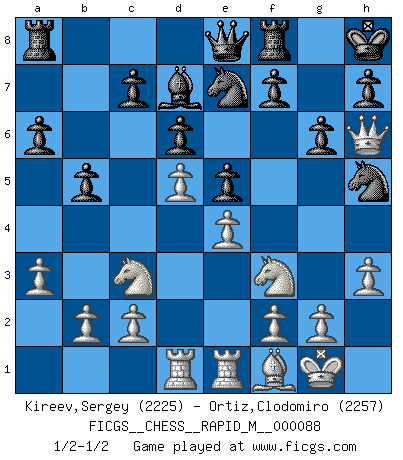 Last move : 1/2-1/2 2017 July 15 16:14:44 [Event "FICGS__CHESS__RAPID_M__000088"] [Site "FICGS"] [Date "2017.07.05"] [Round "1"] [White "Kireev,Sergey"] [Black "Ortiz,Clodomiro"] [Result "1/2-1/2"] [WhiteElo "2225"] [BlackElo "2257"] 1.e4 g6 2.d4 Bg7 3.Nc3 d6 4.Nf3 Nf6 5.Be2 O-O 6.O-O e6 7.Re1 Nc6 8.Be3 a6 9.h3 b5 10.a3 e5 11.d5 Ne7 12.Qd2 Bd7 13.Rad1 Qe8 14.Bf1 Nh5 15.Bh6 Bxh6 16.Qxh6 Kh8 1/2-1/2 Robatsch defense : Two knights variation Kingside Castling by player Black (move 5) Kingside Castling by player White (move 6) This chess game ended in a draw. Follow this game move after move (download)You sit at the board and suddenly your heart leaps. Your hand trembles to pick up the piece and move it. But what Chess teaches you is that you must sit there calmly and think about whether it's really a good idea and whether there are other better ideas. (Stanley Kubrick) Die Auseinandersetzung mit Karpow war politisch geprägt. Er stand für das kommunistische System, wurde von dessen Repräsentanten gehätschelt. Ich war der Oppositionelle. Jeder Schachweltmeister spiegelt auch die gesellschaftlichen Verhältnisse wider. Kramnik steht für die Börsen-Generation des Neuen Markts, ideologiefrei, zahlenfixiert. (Garry Kasparov) En el Ajedrez, cuando menos, el valiente hereda la tierra. (Edmar Mednis) Je ne suis pas le dernier à jouer lâchement des coups douteux pendant le zeïtnot de l'adversaire pour l'achever: en effet les coups qui font le plus peur sont ceux que l'on ne comprend pas. Je me fais souvent peur quand je joue. (Un professeur anonyme) Chess, like love, like music, has the power to make people happy. (Siegbert Tarrasch)