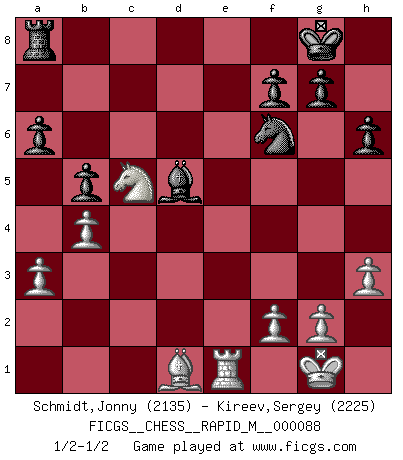 Last move : 1/2-1/2 2017 August 22 11:14:8 [Event "FICGS__CHESS__RAPID_M__000088"] [Site "FICGS"] [Date "2017.07.05"] [Round "1"] [White "Schmidt,Jonny"] [Black "Kireev,Sergey"] [Result "1/2-1/2"] [WhiteElo "2135"] [BlackElo "2225"] 1.e4 e5 2.Nf3 Nc6 3.Bc4 Nf6 4.d3 Bc5 5.c3 d6 6.O-O O-O 7.Bb3 a6 8.Re1 Ba7 9.h3 h6 10.Nbd2 Re8 11.Nf1 Be6 12.Be3 Bxe3 13.Nxe3 Qd7 14.Nh4 Ne7 15.Bc2 c5 16.d4 cxd4 17.cxd4 exd4 18.Qxd4 d5 19.exd5 Nexd5 20.Nxd5 Nxd5 21.Nf3 Rad8 22.a3 b5 23.Ne5 Qd6 24.b4 Nf6 25.Qxd6 Rxd6 26.Rad1 Rxd1 27.Bxd1 Bd5 28.Nd3 Rc8 29.Nc5 Ra8 1/2-1/2 Two knights defense (Modern Bishop's Opening) Kingside Castling by player White (move 6) Kingside Castling by player Black (move 6) This chess game ended in a draw. Follow this game move after move (download)The passed pawn is a criminal, who should be kept under lock and key. Mild measures, such as police surveillance, are not sufficient. (Nimzovitch) Smyslow ist ein Beweis dafür, dass ich noch zehn Jahre spielen kann! [der 75 jährige über den 85 jährigen] (Viktor Kortschnoi) Bobby es la celebridad menos entendida y malinterpretada que camina el la faz de esta tierra. (Yasser Seirawan) Si je n'étais pas joueur d'échecs, je serais le meilleur dans quelque chose d'autre. (Anatoli Karpov) Good luck. You're gonna need it. (Han Solo in Star Wars ep.6)