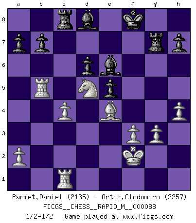 Last move : 1/2-1/2 2017 July 19 5:18:43 [Event "FICGS__CHESS__RAPID_M__000088"] [Site "FICGS"] [Date "2017.07.05"] [Round "1"] [White "Parmet,Daniel"] [Black "Ortiz,Clodomiro"] [Result "1/2-1/2"] [WhiteElo "2135"] [BlackElo "2257"] 1.e4 g6 2.d4 Bg7 3.c4 d6 4.Nc3 Nf6 5.Nf3 O-O 6.h3 e5 7.d5 Nh5 8.g3 Na6 9.Be3 f5 10.exf5 gxf5 11.Ng5 Nf6 12.Qd2 Nc5 13.b4 f4 14.bxc5 fxe3 15.Qxe3 Bh6 16.Bd3 Qe7 17.cxd6 cxd6 18.Rb1 Rf7 19.f3 Nxd5 20.Nxd5 Qxg5 21.Qxg5+ Bxg5 22.h4 Bd8 23.Be4 Be6 24.Ke2 Rc8 25.Rhc1 Kf8 26.Kf2 Rg7 27.Rb5 1/2-1/2 Robatsch (Modern) defense Kingside Castling by player Black (move 5) This chess game ended in a draw. Follow this game move after move (download)The essence of Chess is thinking about what Chess is. (David Bronstein) Herr Iljumschinow ist ein etwas merkwürdiger Geschäftsmann: Er arbeitet zusammen mit Leuten wie Muammar al-Gaddafi; früher ist das Saddam Hussein gewesen. (Joel Lautier) Botvinnik trató de alejar el misterio referente al Ajedrez, siempre relacionandolo a situaciones de la vida diaria. Solía llamar al Ajedrez un problema inexacto típico, similar a aquellos en que la gente tiene siempre que resolver a cada día. (Garry Kasparov) On est toujours la mazette de quelqu'un d'autre. (Anonyme) The only sure thing about luck is that it will change. (Wilson Mizner)