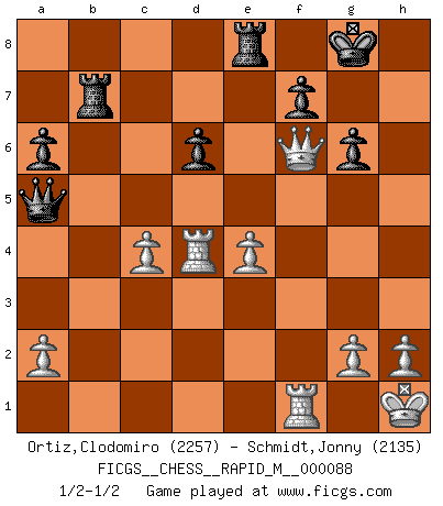 Last move : 1/2-1/2 2017 August 20 17:34:2 [Event "FICGS__CHESS__RAPID_M__000088"] [Site "FICGS"] [Date "2017.07.05"] [Round "1"] [White "Ortiz,Clodomiro"] [Black "Schmidt,Jonny"] [Result "1/2-1/2"] [WhiteElo "2257"] [BlackElo "2135"] 1.Nf3 c5 2.e4 d6 3.d4 cxd4 4.Nxd4 Nc6 5.c4 Nf6 6.Nc3 g6 7.Be2 Nxd4 8.Qxd4 Bg7 9.Be3 O-O 10.Qd2 Be6 11.Bd4 Qa5 12.Rd1 Rfc8 13.b3 a6 14.f4 b5 15.O-O bxc4 16.f5 Bd7 17.Bxc4 Bb5 18.Qe2 Bxc4 19.bxc4 Rab8 20.Kh1 Re8 21.fxg6 hxg6 22.Qf2 e5 23.Nd5 exd4 24.Nxf6+ Bxf6 25.Qxf6 Rb7 26.Rxd4 1/2-1/2 Reti Opening Kingside Castling by player Black (move 9) Kingside Castling by player White (move 15) This chess game ended in a draw. Follow this game move after move (download)Adequate compensation for a sacrifice is having a sound combination leading to a winning position; adequate compensation for a blunder is having your opponent snatch defeat from the jaws of victory. (Bruce A. Moon) Schach ist gnadenlos. Du mußt bereit sein zu töten. (Nigel Short) No hay precio que no valga la pena por la cabellera del Rey enemigo. (Koblentz) Les pièces de l'échiquier étaient impitoyables. Elles le retenaient, elles l'absorbaient. Il y avait de l'horreur en cela, mais aussi une harmonie unique. Car, qu'y a-t-il dans le monde, à part les échecs ? (V. Nabokov) The ultimate in disposing one's troops is to be without ascertainable shape. Then the most penetrating spies cannot pry in nor can the wise lay plans against you. (Sun Tzu)