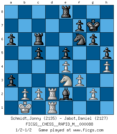 Last move : 1/2-1/2 2017 September 11 15:6:40 [Event "FICGS__CHESS__RAPID_M__000088"] [Site "FICGS"] [Date "2017.07.05"] [Round "1"] [White "Schmidt,Jonny"] [Black "Jabot,Daniel"] [Result "1/2-1/2"] [WhiteElo "2135"] [BlackElo "2127"] 1.e4 c5 2.Nc3 Nc6 3.Nge2 g6 4.d4 cxd4 5.Nxd4 Bg7 6.Be3 Nf6 7.Bc4 O-O 8.Bb3 d6 9.f3 Bd7 10.h4 h5 11.Qd2 Rc8 12.O-O-O Ne5 13.Bh6 Nc4 14.Bxc4 Rxc4 15.Bxg7 Kxg7 16.Qd3 Rc8 17.Kb1 Qa5 18.Rhe1 a6 19.a3 Rfe8 20.Qd2 Rc4 21.Qe3 e5 22.Nde2 Rc6 23.Rd3 Be6 24.Red1 Qc5 25.Qxc5 dxc5 26.Ng3 b5 27.Nf1 b4 28.Ne2 Bc4 29.R3d2 bxa3 30.Ne3 Bxe2 1/2-1/2 Sicilian : chameleon variation Kingside Castling by player Black (move 7) Queenside Castling by player White (move 12) This chess game ended in a draw. Follow this game move after move (download)You know, comrade Pachman, I don't enjoy being a Minister, I would rather play Chess like you. (Che Guevara) Das Zentrum ist der Balkan des Schachbretts - Kriegshandlungen können in jedem Moment ausbrechen. (Aaron Nimzowitsch) Debes de llevar a tu oponente hacia un profundo y obscuro bosque donde 2+2=5, y el camino que conduce a la salida es suficientemente ancho para solamente uno. (Mikhail Tal) Il s'avisa de me proposer d'apprendre les échecs qu'il jouait un peu... me voilà forcené des échecs. J'achète un échiquier, je m'enferme dans ma chambre, j'y passe des jours et des nuits à vouloir apprendre par cur toutes les parties. (Jean-Jacques Rousseau, Confessions) Watch your thoughts; they become words. Watch your words; they become actions. Watch your actions; they become habits. Watch your habits; they become character. Watch your character; it becomes your destiny. (Frank Outlaw)