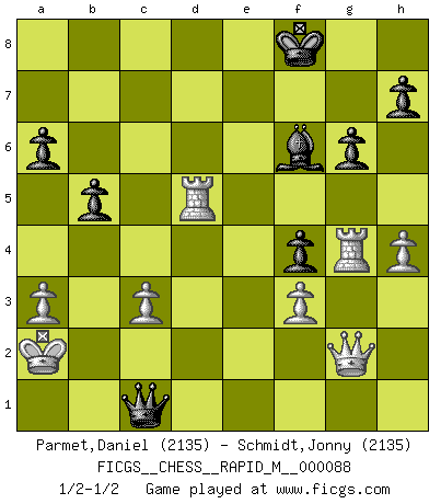 Last move : 1/2-1/2 2017 September 21 23:18:2 [Event "FICGS__CHESS__RAPID_M__000088"] [Site "FICGS"] [Date "2017.07.05"] [Round "1"] [White "Parmet,Daniel"] [Black "Schmidt,Jonny"] [Result "1/2-1/2"] [WhiteElo "2135"] [BlackElo "2135"] 1.e4 c5 2.Nf3 d6 3.d4 cxd4 4.Nxd4 Nf6 5.Nc3 a6 6.Be3 e5 7.Nb3 Be7 8.f3 Be6 9.Qd2 O-O 10.O-O-O Qc7 11.g4 Nbd7 12.Kb1 b5 13.g5 Nh5 14.Nd5 Bxd5 15.exd5 Nb6 16.Na5 Nxd5 17.Qxd5 Qxa5 18.Qb7 Qd8 19.Rg1 Nf4 20.Bxf4 exf4 21.Qd5 Rc8 22.Bd3 g6 23.h4 Qc7 24.Rg4 Qc5 25.Be4 Kg7 26.Qd2 Qe3 27.Qh2 f5 28.gxf6+ Bxf6 29.a3 Rfd8 30.Qg2 Kf8 31.Rd3 Qe1+ 32.Ka2 Qc1 33.c3 d5 34.Bxd5 Rxd5 35.Rxd5 Rxc3 36.bxc3 1/2-1/2 Sicilian : Najdorf, Byrne (English) attack Kingside Castling by player Black (move 9) Queenside Castling by player White (move 10) This chess game ended in a draw. Follow this game move after move (download)If a ruler does not understand Chess, how can he rule over a kingdom ? (King Khusros II) Ein Remis kann durch Wiederholung von drei Zügen oder durch einen schlechte Zug erreicht werden. (Savielly Grigorievitsch Tartakower) Yo tuve un dolor de muelas en la primer partida. En el segundo juego, tuve un dolor de cabeza. En el tercero, tuve un ataque de reumatísmo. En la cuarta partida, no me sentía muy bien. ¿Y en el quinto juego? Bueno, ¿que acaso uno tiene que ganar todos los juegos?. (Siegbert Tarrasch) D'abord les bases : Jouez et étudiez, puis étudiez et jouez, ensuite jouez et étudiez, puis étudiez et jouez. Deuxièmement : Donnez toujours le meilleur de vous-même ! (Ken Smith) If we knew what we were doing, we would not call it research. (Albert Einstein)