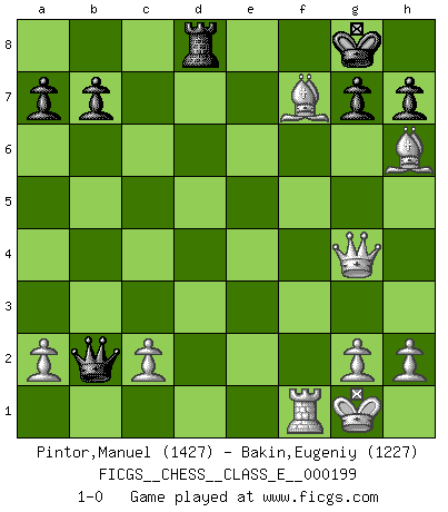 Last move : 1-0 2017 July 27 13:52:31 [Event "FICGS__CHESS__CLASS_E__000199"] [Site "FICGS"] [Date "2017.07.14"] [Round "1"] [White "Pintor,Manuel"] [Black "Bakin,Eugeniy"] [Result "1-0"] [WhiteElo "1427"] [BlackElo "1227"] 1.e4 e5 2.f4 exf4 3.Nf3 Nf6 4.Nc3 c6 5.Bc4 d5 6.exd5 cxd5 7.Bb3 Bc5 8.d4 Qe7+ 9.Ne2 Bd6 10.O-O O-O 11.Nxf4 Bxf4 12.Bxf4 Ng4 13.Ne5 Be6 14.Nxg4 Bxg4 15.Qxg4 Nc6 16.Bxd5 Nxd4 17.Bh6 Qe5 18.Rae1 Ne2+ 19.Rxe2 Qxb2 20.Ref2 Rad8 21.Rxf7 Rxf7 22.Bxf7+ 1-0 KGA : Schallop defense Kingside Castling by player White (move 10) Kingside Castling by player Black (move 10) Player White won this chess game. Follow this game move after move (download)Chess is above all, a fight ! (Emanuel Lasker) Man gibt nur Pakete auf. (Paul Keres) Aquellos que dicen que entienden al Ajedrez, no entienden nada. (Robert Hubner) Ce qui caractérise les parties de combat, c'est que si le défenseur a constamment de difficiles problèmes à résoudre, l'attaquant doit chercher sans relâche de nouvelles possibilités d'attaque. (Koblentz) Lottery : A tax on people who are bad at math. (Author unknown)
