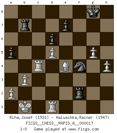 Last move : 1-0 2007 June 27 15:0:28 [Event "FICGS__CHESS__RAPID_A__000017"] [Site "FICGS"] [Date "2007.04.11"] [Round "1"] [White "Riha,Josef"] [Black "Haluschka,Rainer"] [Result "1-0"] [WhiteElo "1931"] [BlackElo "1947"] 1.e4 c5 2.Nf3 g6 3.d4 cxd4 4.Nxd4 Bg7 5.Nc3 Nc6 6.Be3 d6 7.Qd2 Nf6 8.f3 h5 9.O-O-O Bd7 10.Bc4 Ne5 11.Be2 Qc8 12.b3 O-O 13.h3 Qd8 14.g4 Nc6 15.Nxc6 Bxc6 16.Kb1 h4 17.Rhg1 Nd7 18.Bg5 Rc8 19.Rgf1 Bf6 20.Bxf6 Nxf6 21.Bc4 Kg7 22.g5 Nh5 23.Rg1 a6 24.Rg4 b5 25.Bf1 Qb6 26.Rxh4 Qc5 27.Nd5 Bxd5 28.exd5 Ng3 29.Rf4 Rb8 30.Bd3 Nh5 31.Re4 Rb7 32.c4 bxc4 33.Bxc4 Qa7 34.f4 f6 35.Bd3 fxg5 36.Qb2+ Kh7 37.fxg5 Kg8 38.Rc4 Qf2 39.Qxf2 Rxf2 40.Bxg6 Nf4 41.Be4 a5 42.h4 1-0 This chess game has been lost on time (started : 2007.04.11 11:52:30) Sicilian : Hungarian variation Queenside Castling by player White (move 9) Kingside Castling by player Black (move 12) Player White won this chess game. Follow this game move after move (download)The game of Chess is not merely an idle amusement; several very valuable qualities of the mind are to be acquired and strengthened by it, so as to become habits ready on all occasions; for life is a kind of Chess. (Benjamin Franklin) Ich habe Kasparov in Rente geschickt. (Veselin Topalov) El Ajedrez por encima de todo... ¡es una pelea!. (Emanuel Lasker) Un footballeur joue avec ses pieds, parfois avec sa tête. Un joueur d'échecs ne joue qu'avec sa tête. Et quand il ne joue plus, il meurt. (Jacob Murray) Kids, you tried your best and you failed miserably. The lesson is, never try. (Simpsons)