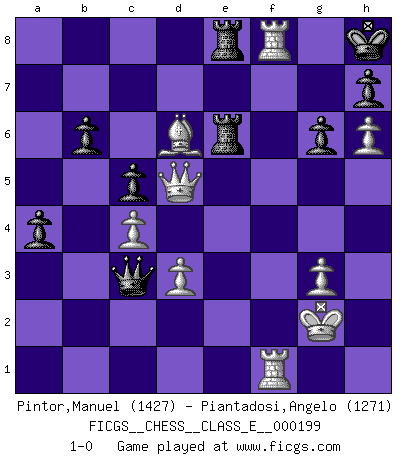 Last move : 1-0 2017 August 26 21:47:38 [Event "FICGS__CHESS__CLASS_E__000199"] [Site "FICGS"] [Date "2017.07.14"] [Round "1"] [White "Pintor,Manuel"] [Black "Piantadosi,Angelo"] [Result "1-0"] [WhiteElo "1427"] [BlackElo "1271"] 1.e4 c5 2.Nc3 Nc6 3.g3 d6 4.Bg2 Nf6 5.h3 e6 6.d3 Be7 7.f4 O-O 8.Nf3 b6 9.e5 dxe5 10.Nxe5 Bb7 11.Bxc6 Bxc6 12.Nxc6 Qc7 13.Nxe7+ Qxe7 14.O-O Rfd8 15.Qf3 Nd5 16.Ne4 Nb4 17.Rf2 Nd5 18.f5 exf5 19.Qxf5 Nf6 20.Nxf6+ Qxf6 21.Qg4 Qd4 22.Qf5 f6 23.Kg2 Rd5 24.Qf3 Re8 25.Bf4 Rd7 26.Qc6 Rde7 27.Qf3 Qxb2 28.Raf1 Qxa2 29.h4 a5 30.h5 a4 31.c4 Qb3 32.h6 g6 33.Qd5+ Kh8 34.Bd6 Re6 35.Rxf6 Qb2+ 36.R6f2 Qc3 37.Rf8+ 1-0 Sicilian : Closed Kingside Castling by player Black (move 7) Kingside Castling by player White (move 14) Player White won this chess game. Follow this game move after move (download)Chess is not like life... it has rules ! (Mark Pasternak) Der Freibauer hat für mich eine Seele, genau wie der Mensch, Wünsche, die unerkannt in ihm schlummern, und Befürchtungen, von deren Existenz er selbst kaum ahnt. (Aaron Nimzowitsch) El Ajedrez es parte de la cultura, y si una cultura esta en decadencia, entonces también el Ajedrez declinará. (Mikhail Botvinnik) Il (Jacob Murray) ne joue pas pour le bon coup, mais pour le meilleur. (Eloi Relange) No, I am still playing. (Anatoly Karpov)