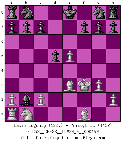 Last move : 0-1 2017 July 19 18:37:42 [Event "FICGS__CHESS__CLASS_E__000199"] [Site "FICGS"] [Date "2017.07.14"] [Round "1"] [White "Bakin,Eugeniy"] [Black "Price,Eric"] [Result "0-1"] [WhiteElo "1227"] [BlackElo "1452"] 1.e4 e5 2.f4 d5 3.fxe5 Qh4+ 4.g3 Qxe4+ 5.Qe2 Qxh1 6.Nf3 Bg4 7.Kf2 Bxf3 8.Qxf3 Bc5+ 9.d4 Bxd4+ 10.Be3 Qxf3+ 11.Kxf3 Bxb2 0-1 KGD : Falkbeer counter-gambit Player Black won this chess game. Follow this game move after move (download)Chess is ruthless: you've got to be prepared to kill people. (Nigel Short) Kein Schachspieler kann gut schlafen. (H. G. Wells) No hay precio que no valga la pena por la cabellera del Rey enemigo. (Koblentz) Aux échecs, l'amour-propre est satisfait quand on remporte la victoire, mais il n'y a pas de honte à être battu. (Benjamin Franklin) There are two types of people in this world, good and bad. The good sleep better, but the bad seem to enjoy the waking hours much more. (Woody Allen)