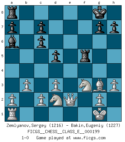 Last move : 1-0 2017 August 25 15:47:55 [Event "FICGS__CHESS__CLASS_E__000199"] [Site "FICGS"] [Date "2017.07.14"] [Round "1"] [White "Zemlyanov,Sergey"] [Black "Bakin,Eugeniy"] [Result "1-0"] [WhiteElo "1216"] [BlackElo "1227"] 1.e4 e5 2.Nf3 Nc6 3.Bb5 Nf6 4.d3 Bc5 5.Nbd2 O-O 6.O-O Ng4 7.h3 Nxf2 8.Rxf2 Bxf2+ 9.Kxf2 d5 10.Bxc6 bxc6 11.Qe2 f5 12.exf5 Rxf5 13.b3 Qf6 14.Bb2 Qh4+ 15.Kg1 Qg3 16.Bxe5 Ba6 17.Bxg3 1-0 Ruy Lopez : Berlin defense Kingside Castling by player Black (move 5) Kingside Castling by player White (move 6) Player White won this chess game. Follow this game move after move (download)All that matters on the Chessboard is good moves. (Bobby Fischer) Wer nie einen Fehler gemacht hat, hat nie etwas Neues ausprobiert. (Albert Einstein) Aquel que ve no otra dirección en el juego que la de dar Jaque Mate a su oponente, nunca será un buen jugador de Ajedrez. (Euwe) Horreur, mais aussi harmonie suprême : qu'y avait-il en effet au monde en dehors des échecs ? Le brouillard, l'inconnu, le non-être... (Vladimir Nabokov) They say poker is a zero-sum game. It must be, because every time I play my sum ends up zero. (Max Shapiro)