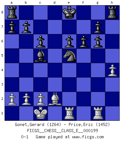 Last move : 0-1 2017 July 20 19:42:2 [Event "FICGS__CHESS__CLASS_E__000199"] [Site "FICGS"] [Date "2017.07.14"] [Round "1"] [White "Gonet,Gerard"] [Black "Price,Eric"] [Result "0-1"] [WhiteElo "1264"] [BlackElo "1452"] 1.d4 Nf6 2.f3 d5 3.e4 dxe4 4.Nc3 Bf5 5.g4 Bg6 6.h4 exf3 7.Qxf3 c6 8.Bd3 e6 9.Bd2 Qxd4 10.O-O-O Qxg4 11.Qxg4 Nxg4 12.Bxg6 hxg6 13.Re1 Be7 14.Nf3 Nd7 15.Ne4 f6 16.Rhg1 Nde5 17.Nxe5 Nxe5 18.Nc5 Bxc5 0-1 Blackmar-Diemer gambit Queenside Castling by player White (move 10) Player Black won this chess game. Follow this game move after move (download)If cunning alone were needed to excel, women would be the best Chess players. (Albin) Es gibt nur zwei wahre Schachgenies - das andere war Wilhelm Steinitz, der Weltmeister von 1872 bis 1894. (Robert James Fischer) Hasta este punto, las blancas han seguido un análisis bien conocido. Pero ahora el hace un error fatal: empieza a usar su propia cabeza. (Siegbert Tarrasch) Les échecs sont un jeu par leur forme, un art par leur essence et une science par sa difficulté d'acquisition. Ils peuvent vous procurer autant de plaisir qu'un bon livre ou une belle musique, mais vous n'aurez une réelle joie que si vous arrivez à bien jouer. (Tigran Petrosian) The only thing that matters is the evidence. (Horatio Caine, C.S.I. Miami)