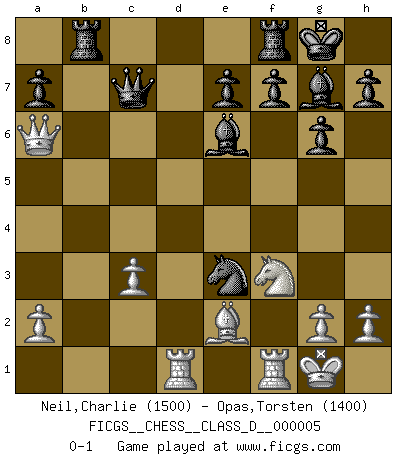 Last move : 0-1 2006 August 3 11:45:34 [Event "FICGS__CHESS__CLASS_D__000005"] [Site "FICGS"] [Date "2006.06.01"] [Round "1"] [White "Neil,Charlie"] [Black "Opas,Torsten"] [Result "0-1"] [WhiteElo "1500"] [BlackElo "1400"] 1.d4 Nf6 2.c4 g6 3.Nc3 d5 4.cxd5 Nxd5 5.e4 Nxc3 6.bxc3 Bg7 7.Qb3 c5 8.Bc4 O-O 9.Be3 cxd4 10.Rd1 Nc6 11.Nf3 Na5 12.Qb5 Bd7 13.Qb4 Nc6 14.Qxb7 Rb8 15.Qa6 dxe3 16.O-O Qc7 17.fxe3 Ne5 18.Be2 Ng4 19.e5 Nxe3 20.e6 Bxe6 0-1 King's Indian defense, 3.Nc3 Kingside Castling by player Black (move 8) Kingside Castling by player White (move 16) Player Black won this chess game. Follow this game move after move (download)At this time Fischer is simply a level above all the best Chessplayers in the world. (John Jacobs) Jeder Schachmeister war einmal ein Anfänger. (Irving Chernev) Un buen jugador siempre tiene buena suerte. (José Raúl Capablanca) Des idées, des idées, j'en ai cent, j'en ai mille. Des bonnes, des mauvaises, applicables, irréalisables... Il suffit de faire le tri ! (Roos) For to win one hundred victories in one hundred battles is not the acme of skill. To subdue the enemy without fighting is the acme of skill. (Sun Tzu)