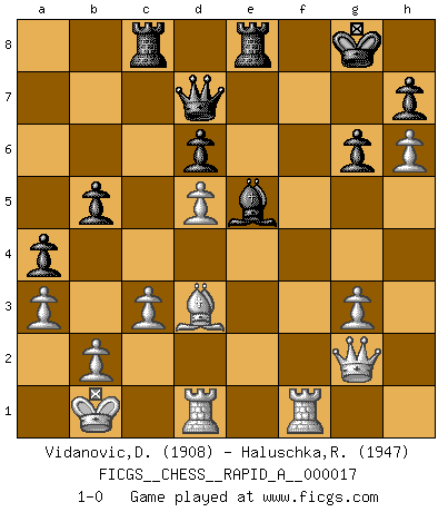 Last move : 1-0 2007 July 19 5:38:44 [Event "FICGS__CHESS__RAPID_A__000017"] [Site "FICGS"] [Date "2007.04.11"] [Round "1"] [White "Vidanovic,Djordje"] [Black "Haluschka,Rainer"] [Result "1-0"] [WhiteElo "1908"] [BlackElo "1947"] 1.e4 c5 2.Nf3 e6 3.d4 cxd4 4.Nxd4 Nf6 5.Nc3 d6 6.Be2 e5 7.Nb3 Be7 8.Qd3 Nc6 9.Be3 O-O 10.O-O-O a5 11.a3 Be6 12.Nd5 Rc8 13.Kb1 a4 14.Nd2 Nd7 15.Nc4 Nd4 16.Bxd4 Bxd5 17.exd5 exd4 18.Qxd4 Bf6 19.Qd2 Nb6 20.Qb4 Nxc4 21.Bxc4 Qd7 22.Bd3 Rc5 23.Rhe1 g6 24.Qe4 b5 25.c3 Qb7 26.Be2 Rc7 27.h4 Rfc8 28.Qb4 Rc5 29.h5 Re8 30.h6 Qd7 31.Qf4 Be5 32.Qd2 Kf8 33.g3 Bf6 34.Qf4 Be5 35.Qg5 f5 36.Bf1 Kf7 37.Qd2 f4 38.Bd3 fxg3 39.fxg3 Kg8 40.Rf1 R5c8 41.Qg2 1-0 This chess game has been lost on time (started : 2007.04.11 11:52:30) Sicilian : Anderssen variation Kingside Castling by player Black (move 9) Queenside Castling by player White (move 10) Player White won this chess game. Follow this game move after move (download)There just isn't enough televised Chess. (David Letterman) Deine Wertungszahl - vorausgesetzt einige Jahre schachliche Anstrengung - entspricht etwa dem zehnfachen Deines IQ plus 1000. (Jonathan Levitt) ¿Porque tengo que perder ante este idiota?. (Aron Nimzovich) Horreur, mais aussi harmonie suprême : qu'y avait-il en effet au monde en dehors des échecs ? Le brouillard, l'inconnu, le non-être... (Vladimir Nabokov) The next best thing to gambling and winning is gambling and loosing. (Nick Dandalos)