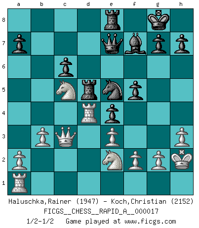 Last move : 1/2-1/2 2007 June 13 14:24:4 [Event "FICGS__CHESS__RAPID_A__000017"] [Site "FICGS"] [Date "2007.04.11"] [Round "1"] [White "Haluschka,Rainer"] [Black "Koch,Christian"] [Result "1/2-1/2"] [WhiteElo "1947"] [BlackElo "2152"] 1.d4 d5 2.c4 e6 3.Nc3 Nf6 4.cxd5 exd5 5.Bg5 Be7 6.e3 c6 7.Qc2 O-O 8.Bd3 Nbd7 9.h3 Re8 10.Nf3 Nf8 11.Bf4 Ng6 12.Bh2 Bd6 13.Bxd6 Qxd6 14.O-O Qe7 15.Rfd1 Ne4 16.Bxe4 dxe4 17.Nd2 f5 18.d5 Qf6 19.Nb3 Ne5 20.dxc6 bxc6 21.Nc5 Be6 22.Rd4 Qg5 23.Kh2 Qe7 24.Ne2 Bf7 25.Qc3 Rad8 26.b3 Rd5 1/2-1/2 QGD : Exchange, positional line Kingside Castling by player Black (move 7) Kingside Castling by player White (move 14) This chess game ended in a draw. Follow this game move after move (download)Later, I began to succeed in decisive games. Perhaps because I realized a very simple truth: not only was I worried, but also my opponent. (Mikhail Tal) Ich suche im Schach immer etwas Eigenes. Riskantes Spiel im Stile schachlicher Musketiere ist nicht meine Sache, auch wenn es vielen Freunden scharfer Wendungen gefällt. (Anatoly Karpov) Yo nunca en mi vida he jugado la Defensa Francesa, que viene siendo la más aburrida de todas las Aperturas. (Wilhelm Steinitz) Shah mat. Le roi est mort. Cri de fierté d'un joueur venant de terrasser son adversaire, courtoisement, sans effusion de sang. In my experience, there's no such thing as luck. (Obi-Wan Kenobi in Star Wars ep.4)