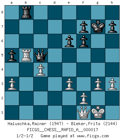 Last move : 1/2-1/2 2007 July 24 16:47:26 [Event "FICGS__CHESS__RAPID_A__000017"] [Site "FICGS"] [Date "2007.04.11"] [Round "1"] [White "Haluschka,Rainer"] [Black "Bleker,Frits"] [Result "1/2-1/2"] [WhiteElo "1947"] [BlackElo "2144"] 1.d4 Nf6 2.c4 e6 3.Nf3 b6 4.g3 Ba6 5.Nbd2 Bb4 6.Qa4 c5 7.dxc5 bxc5 8.a3 Bxd2+ 9.Bxd2 Bb7 10.Bg2 Bc6 11.Qd1 a5 12.O-O O-O 13.b4 Be4 14.bxc5 Qc7 15.Bf4 Qb7 16.Be5 Nc6 17.Bxf6 gxf6 18.Qd2 Qa7 19.Qe3 Bg6 20.Ra2 Rab8 21.Rd2 Rfc8 22.Rfd1 Rc7 23.Qf4 Kg7 24.e3 Rcb7 25.Nd4 Qxc5 26.Nb5 Qh5 27.Bf3 Qh3 28.Rxd7 Rxd7 29.Rxd7 Ne5 30.Rd4 Nxf3+ 31.Qxf3 Bh5 32.Qg2 Qf5 33.Rd2 Bf3 34.Qf1 Qc5 35.h3 Bc6 36.Rb2 Bxb5 37.Rxb5 1/2-1/2 Queen's Indian : Nimzovich variation (exaggerated Fianchetto) Kingside Castling by player White (move 12) Kingside Castling by player Black (move 12) This chess game ended in a draw. Follow this game move after move (download)If Chess is a science, it's a most inexact one. If Chess is an art, it is too exacting to be seen as one. If Chess is a sport, it's too esoteric. If Chess is a game, it's too demanding to be just a game. If Chess is a mistress, she's a demanding one. If Chess is a passion, it's a rewarding one. If Chess is life, it's a sad one. (Unknown) Mutter, ich bin eben Ex-Weltmeister geworden. --beim nach Hause Kommen nach dem Verlust des WM-Titels an Mihail Botvinnik -- (Mikhail Nekhemyevich Tal) Hay dos clases de hombres: aquellos que se conforman en dejarse llevar por las circunstancias y que juegan barajas y aquellos decididos a controlar las circunstancias y que juegan al Ajedrez. (Mortimer Collins) Une platitude souvent récitée à propos des Echecs est qu'une des choses les plus difficiles à réaliser est de gagner une position gagnante. Cela ne manque pas de sens mais, pour ma part, j'ai toujours trouvé plus difficile de gagner une position perdante. (Tim Krabbe) Convictions are more dangerous enemies of truth than lies. (Friedrich Nietzsche)